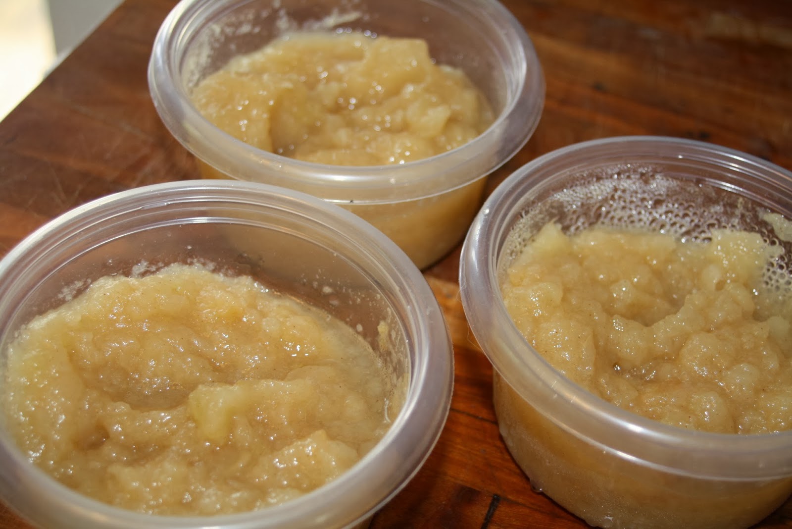When all the chunks and/or slices have started to fall apart… taste it! Is it sweet enough? Is it smooth enough? Add more sugar if you like it sweeter. If you don’t care about the color, add some light brown sugar for a more caramely flavor. I like to add a teaspoon or so of ground cinnamon at this point as well. At this point my stolen applesauce is done! I portion it into small ziploc containers and throw them in the freezer (my kids like to eat it frozen like ice cream). It’s semi sweet, it’s a little chunky, and it’s a terrible brownish swirly color – and it tastes WONDERFUL!