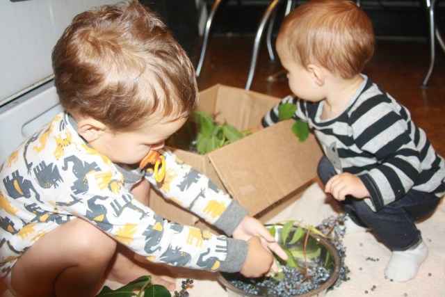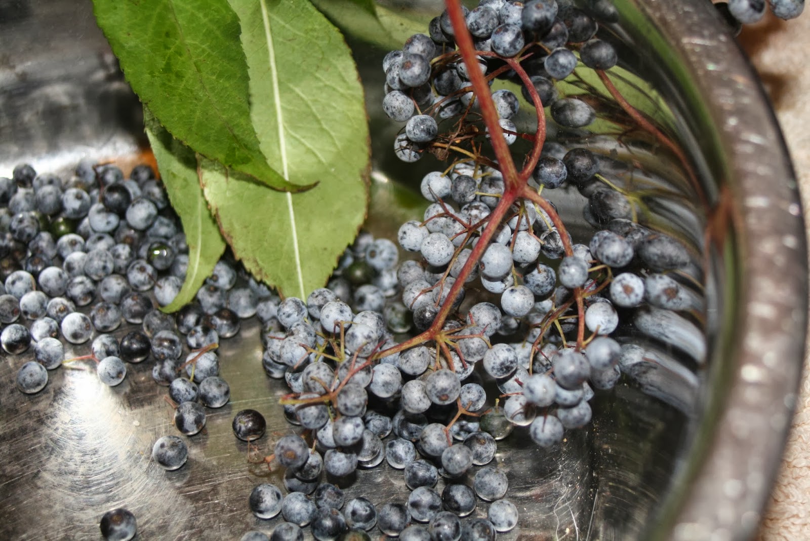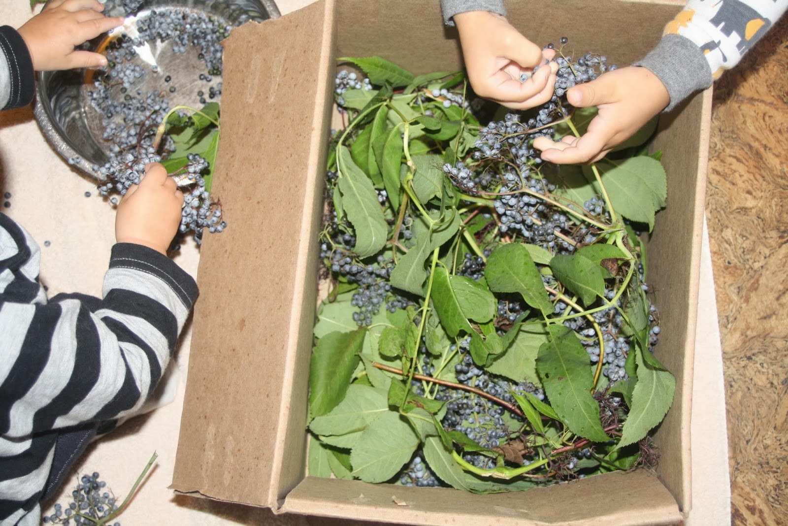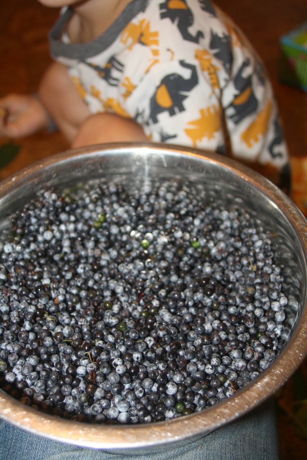 On a wet and chilly Friday morning, the kids and I sat on the kitchen floor and picked a zillion little blue berries, one at a time, off their stubborn branches. The kids actually did a great job, don’t hesitate to invite your helpers. Sure, they ate some, and squished some, and lost interest about 10 minutes too early, but I was impressed at how well they did! I put down a large towel first and was able to easily collect up all their spills.