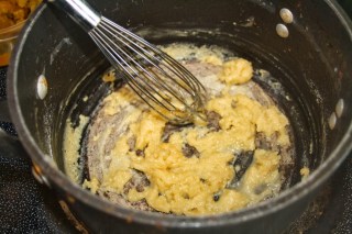 Now to make the bechamel sauce for the top! In a medium saucepan over medium heat, melt 1/4 cup (4 Tbsp) of butter. To that, add 1/4 cup of all-purpose flour and stir/whisk constantly for about 5 minutes.