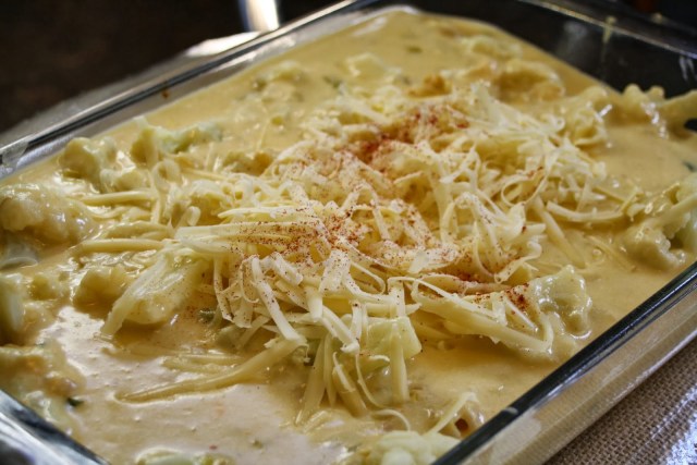 When it tastes perfect, pour it over the noodles and cauliflower. Enlist some help if you need it 😉 Sprinkle with a handful of shredded cheese and a dash of paprika, then pop it in the oven.