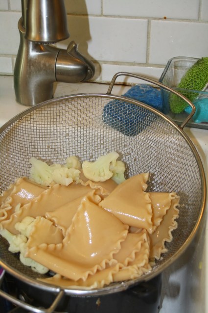 Okay, first things first. Preheat your oven to 375 degrees. Boil up the noodles (lasagna noodles work well, cannelloni or manicotti would be fine, too) and cauliflower (my kids will eat cauliflower so we usually have some handy. Use broccoli if you have that, or you can skip the added veg all together). Keep them both al dente because they will cook further in the oven. You’ll want them to keep their shape for the putting together of this dish. For me that was 12 minutes on the pasta, 6 on the cauliflower.
