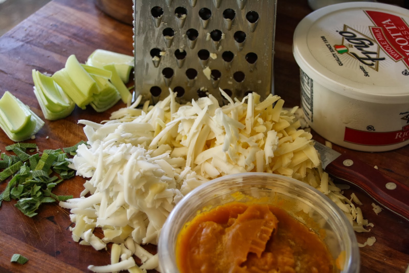 | cobbled together whatever I could find, including pumpkin, cheese, sage, leeks, ricotta cheese, and a cocktail (not pictured) |