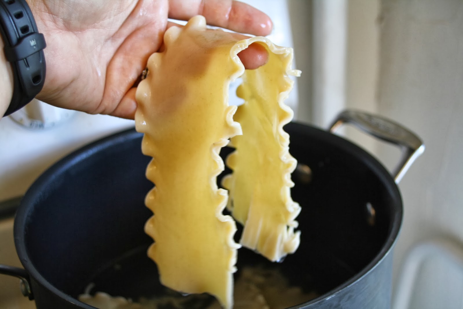 | Standard lasagna noodles are too long. Using scissors cut each noodle in half cross-wise. |