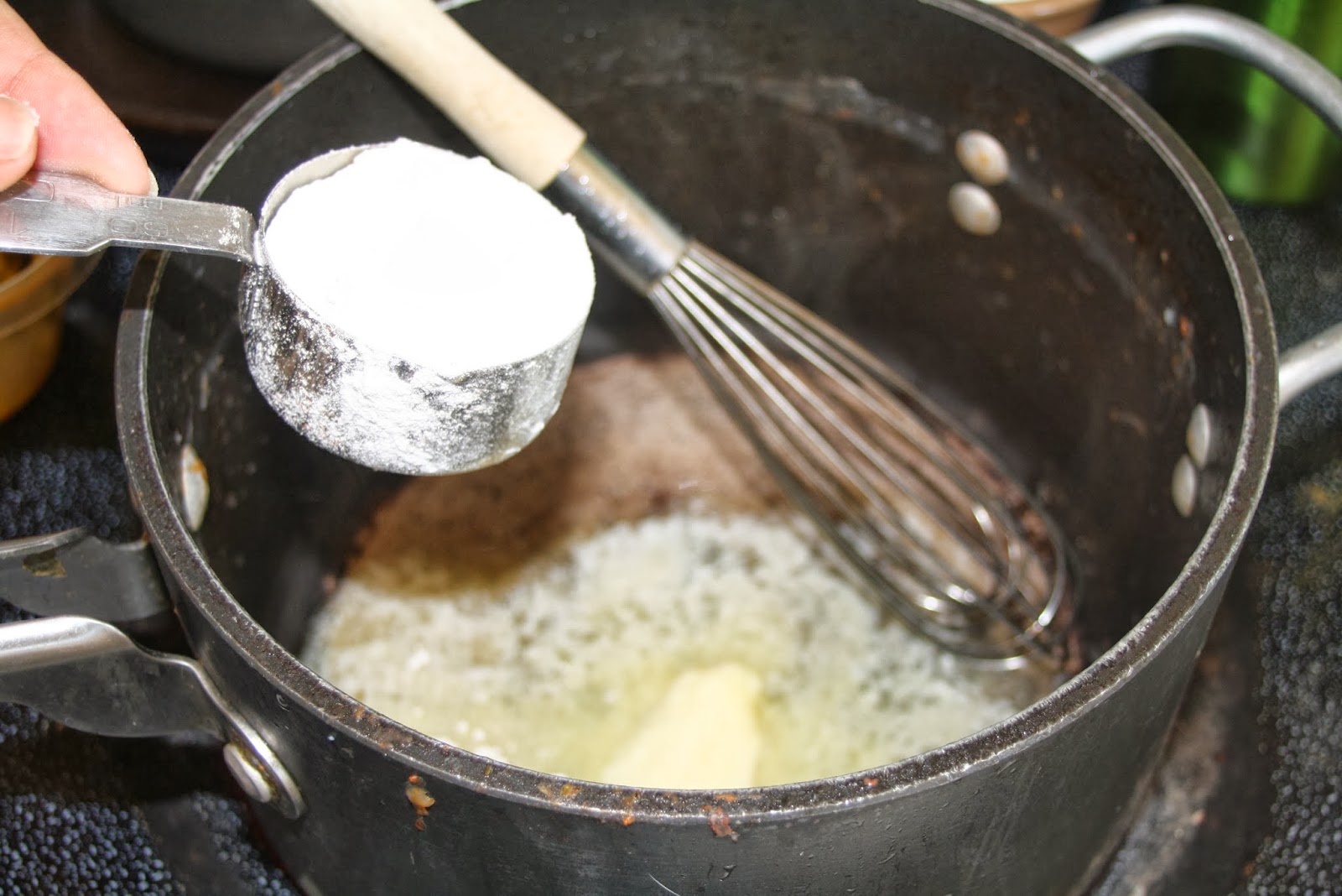 Now to make the bechamel sauce for the top! In a medium saucepan over medium heat, melt 1/4 cup (4 Tbsp) of butter. To that, add 1/4 cup of all-purpose flour and stir/whisk constantly for about 5 minutes.