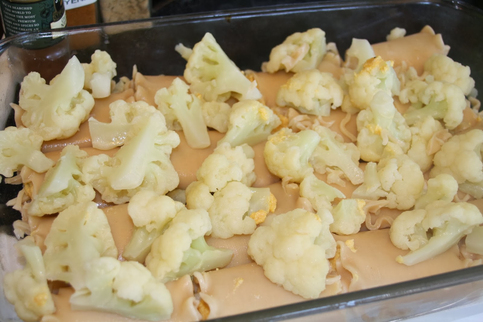 Okay, first things first. Preheat your oven to 375 degrees. Boil up the noodles (lasagna noodles work well, cannelloni or manicotti would be fine, too) and cauliflower (my kids will eat cauliflower so we usually have some handy. Use broccoli if you have that, or you can skip the added veg all together). Keep them both al dente because they will cook further in the oven. You’ll want them to keep their shape for the putting together of this dish. For me that was 12 minutes on the pasta, 6 on the cauliflower.