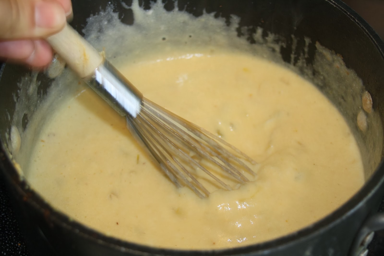 When the smell is so divine that you want to lick the pan, whisk in 3 cups of milk. Keep stirring and in about 5 minutes, the sauce will thicken up. At that point, add about 2 cups of shredded cheese. I used a combination of sharp white cheddar, goat gouda, and manchego. Once the cheese is melted, add in the onions you set aside and any leftover pumpkin filling (waste not, want not, remember??). Once mixed in, taste it. Add salt and pepper if it needs it (usually does). I also added 1/4 tsp of cayenne pepper to this version for fun. You could add mustard if you prefer… It should have a lot of flavor, because the noodles will be a little bland.
