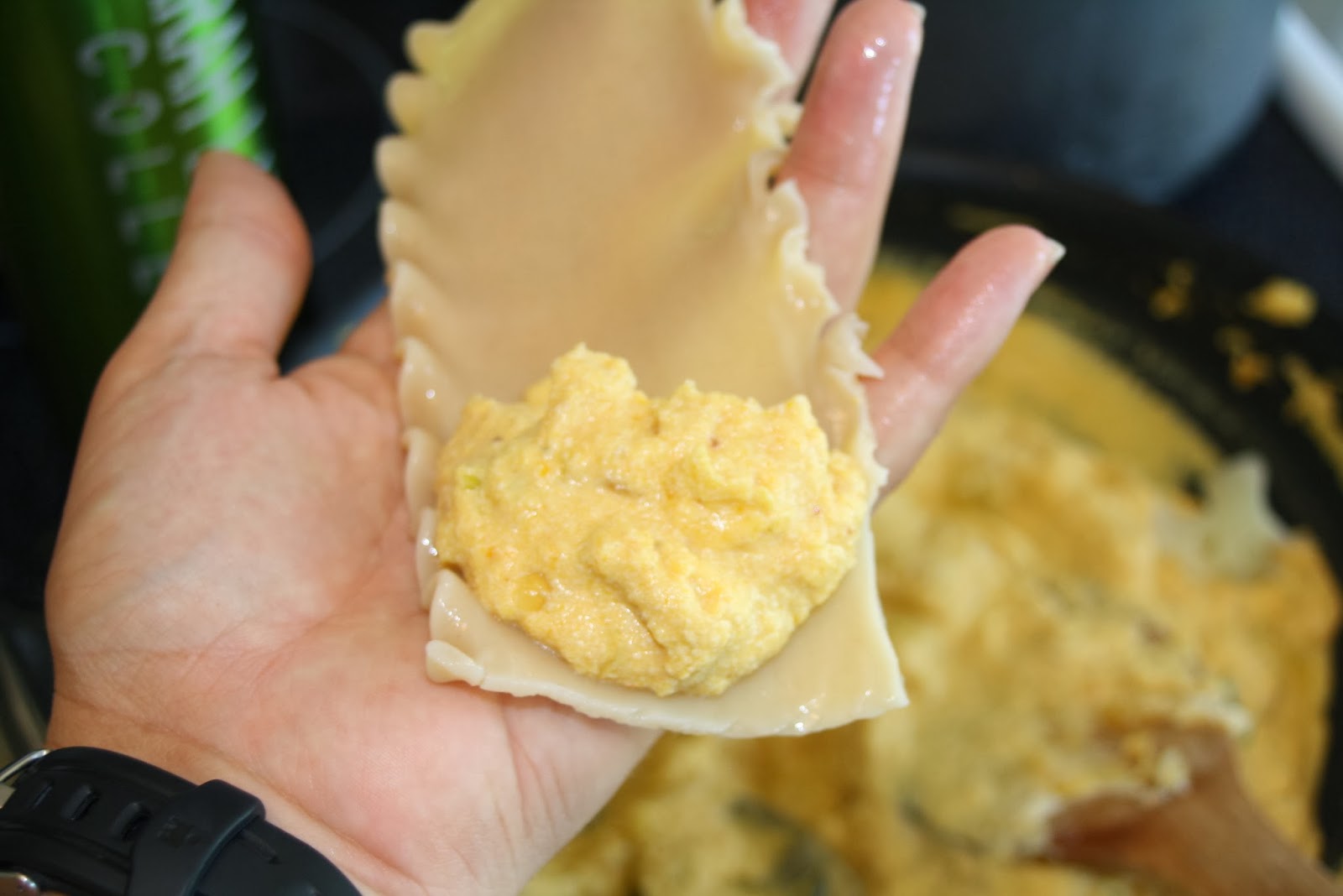 When your onions are done browning up, scoop about half of them out to use in the sauce – don’t forget to do this. To the remaining onions, add the pumpkin (at least 1/2 cup, not more than 3/4 cup), ricotta cheese (at least 2 cups, not more than 4 cups), sage (2-3 Tbsp, cut into slivers), 1 tsp salt, and 1/2 cup of grated Parmesan cheese if you have it. Mix it all up and get ready to fill your noodles.