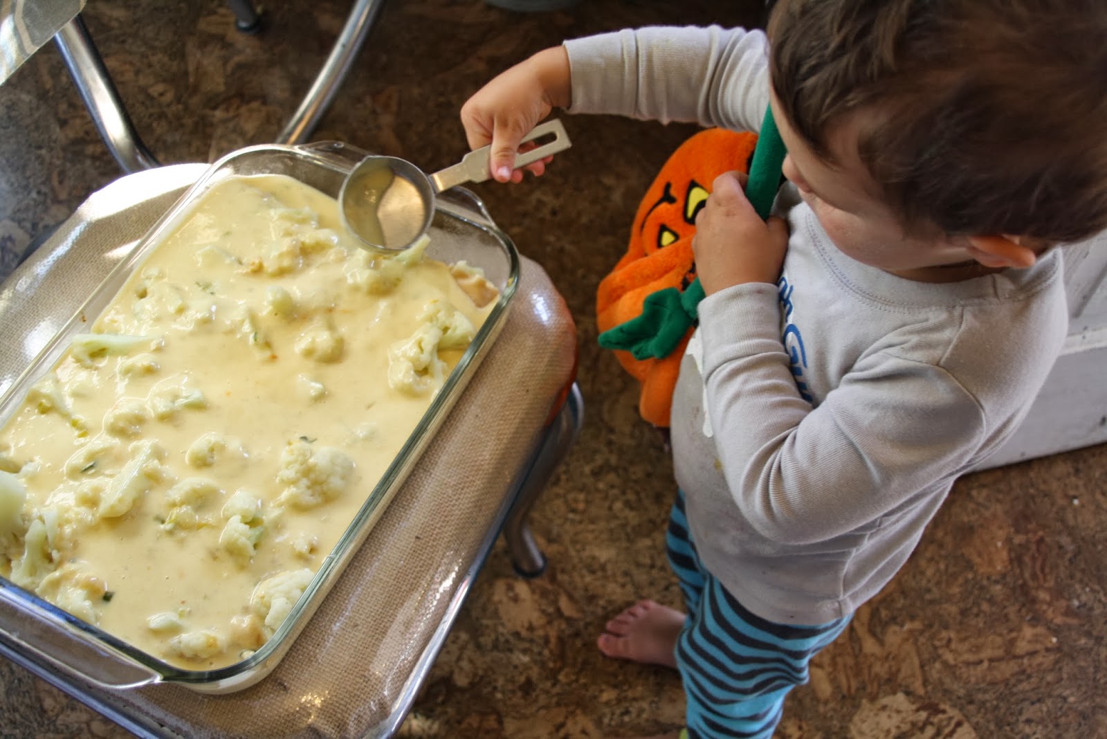 When it tastes perfect, pour it over the noodles and cauliflower. Enlist some help if you need it 😉 Sprinkle with a handful of shredded cheese and a dash of paprika, then pop it in the oven.