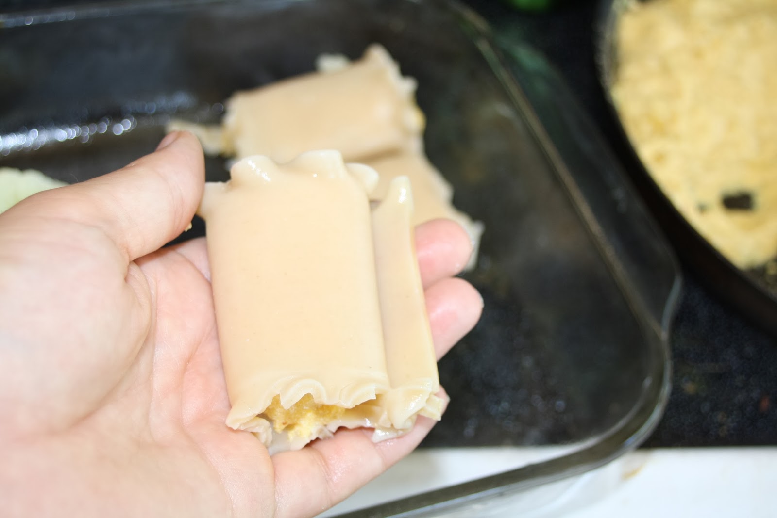 | Spoon about 1/4 cup of pumpkin-y, cheesy yummy sauce onto one end. |