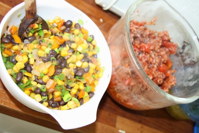 I like to mix a few things together so it’s easier to assemble the layers. Here you see the onions (green and white), peppers, beans, and corn make a “salsa” layer. I had some pink rice already cooked up in the fridge, so I added the can of roasted tomatoes to it along with about 1/4 cup Valentina Sauce. Valentina isn’t spicy, just flavorful, so don’t be afraid to use it liberally. If you have fresh tomatoes, use them – or a can of tomato paste will work in a pinch!