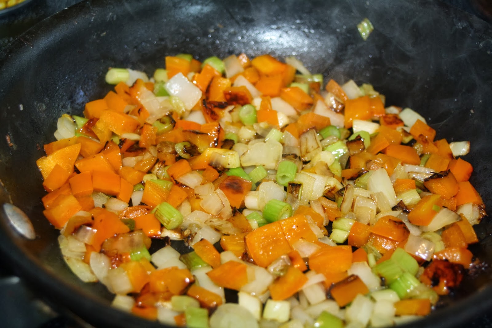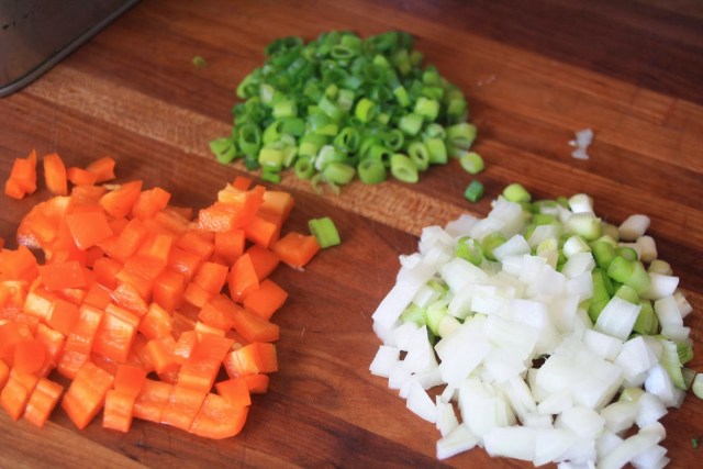 | First, saute the onion and bell pepper in a large frying pan with olive oil and a little salt over med-high heat. Try not to stir too much so you get a nice tough of color on everything. |