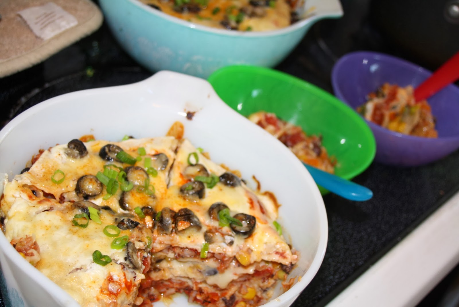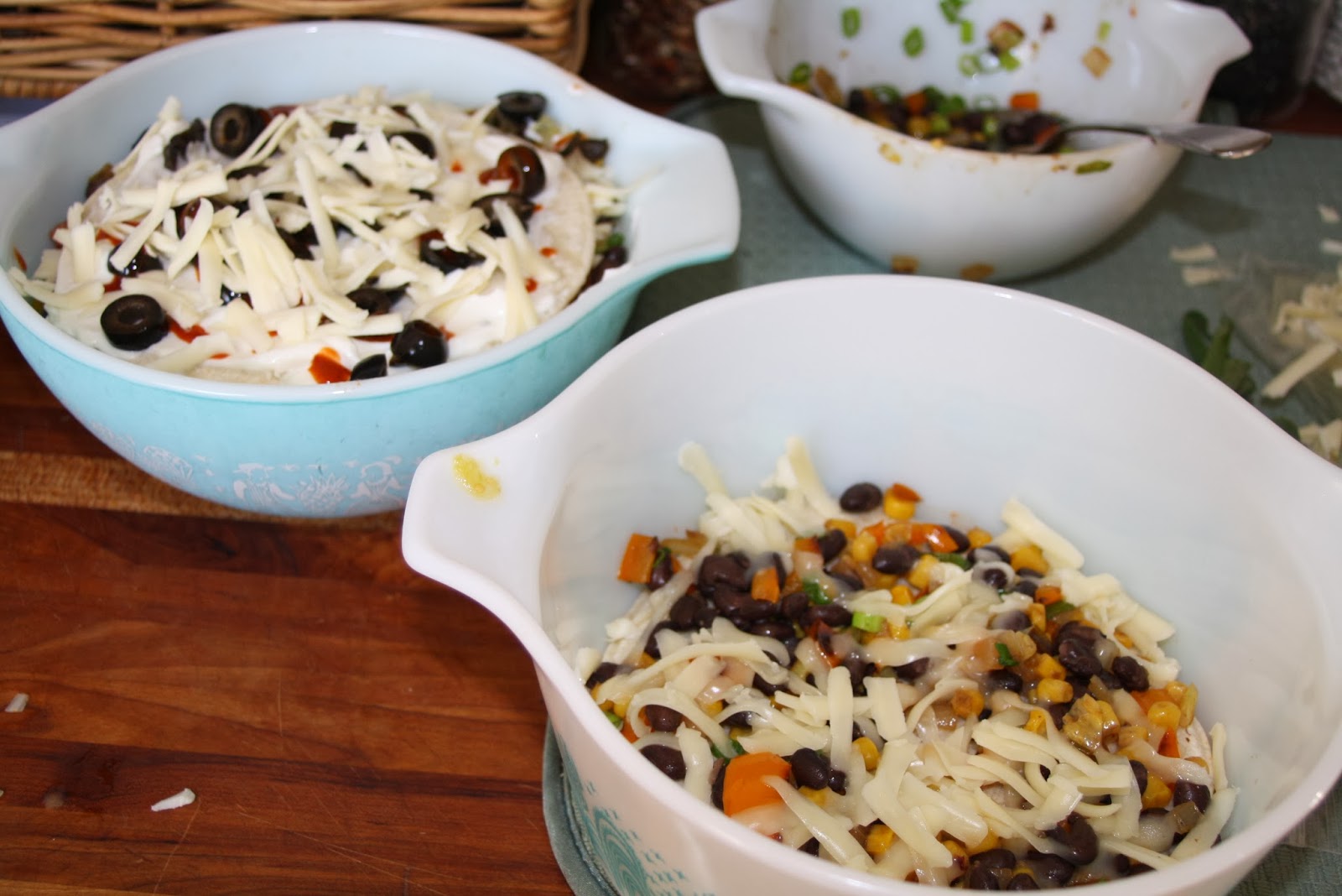 Today I also included sliced black olives and roasted bell peppers. You can add whatever you like/have – including ground beef, grilled chicken, and/or bbq pork. The point is, you’ll use what you have in your pantry and it will be delicious. All you have to do is prepare everything ahead of time and layer it into a “lasagna-style” configuration. After about 30 mins in the oven, you’ll have a wonderful, easy meal for your family.