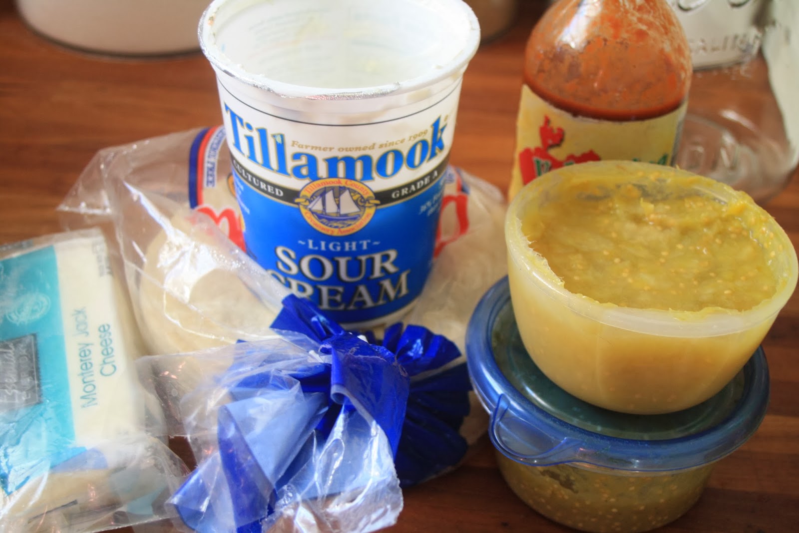 | You’ll need a few more liquidy things to keep this a moist meal. Cheese (I used monterey jack, cheddar is fine, too), sour cream, tomatillo salsa (or green enchilada sauce works great!), Valentina sauce… |