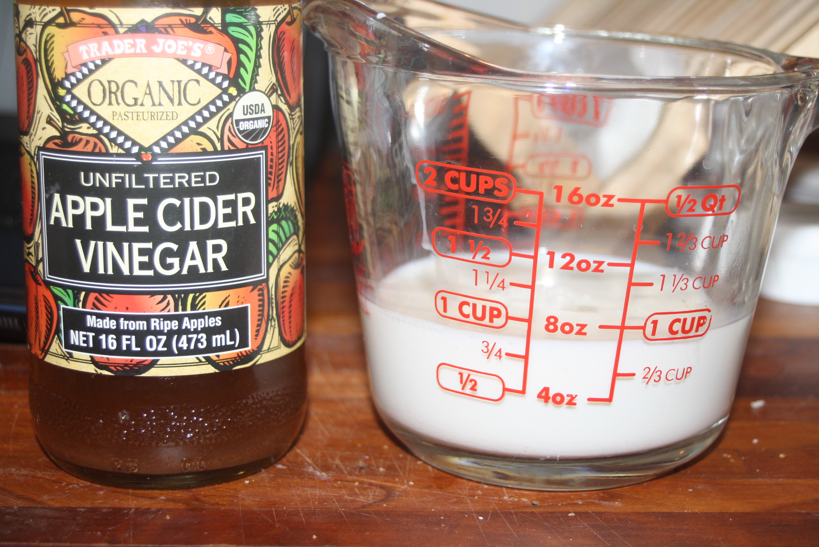 A note about buttermilk… I never have actual buttermilk in the fridge. It is a wonderful flavor and I love it in my baking with it, but since I never have any, I use this trick my mother showed me years ago. Measure out the prescribed about of REGULAR milk (whole works a little better, but any will do in a pinch). To that, add some vinegar, 1 Tbsp for each cup of milk. Set it aside for about 5 minutes and it will curdle up enough to make a buttermilk substitute. Try it!