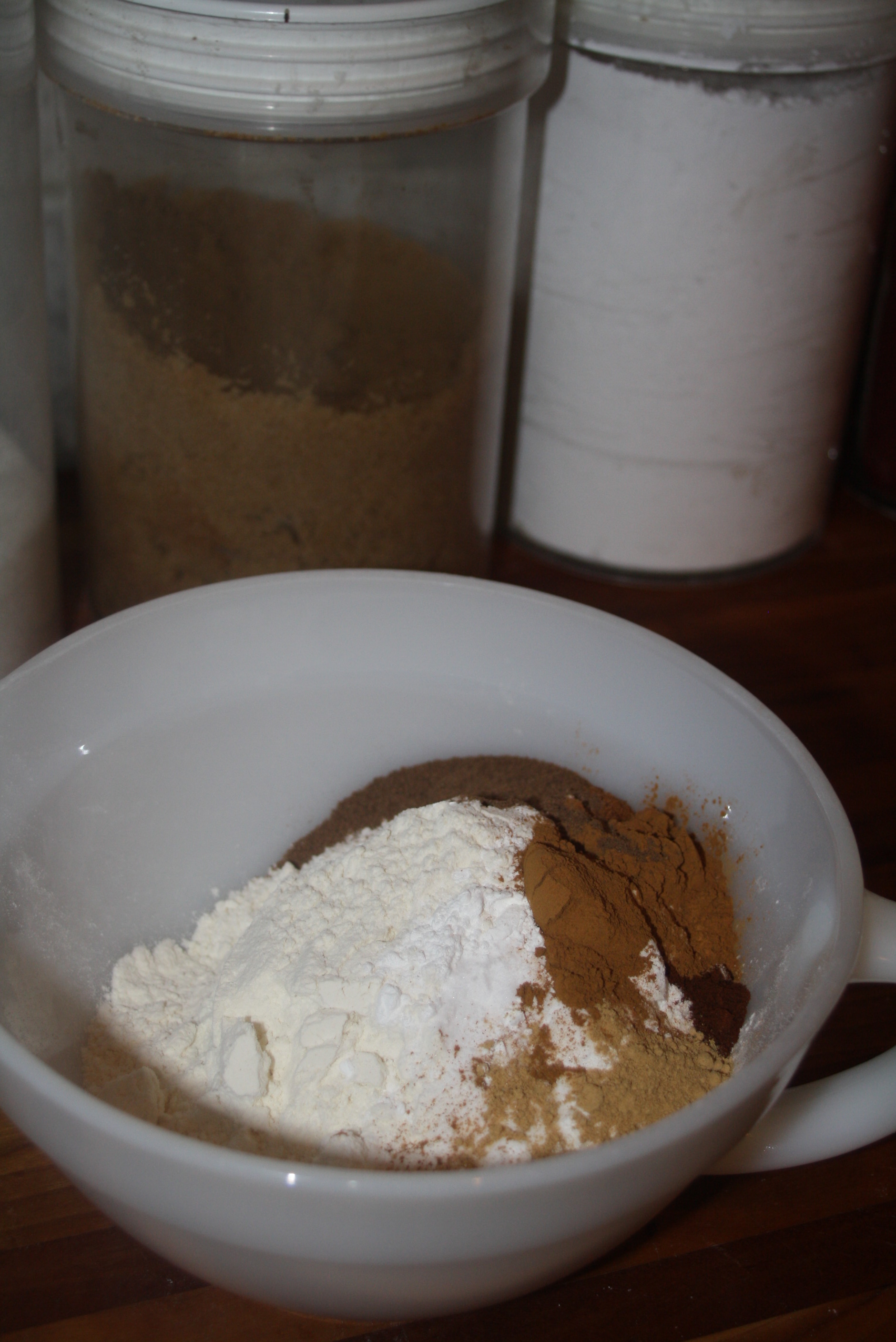 - Whisk together flour, baking powder, baking soda, cinnamon, allspice, nutmeg, ginger, cloves, and salt in a bowl. Note: there are a lot of spices here. If you only have 3 or 4 of the five, that’s fine. Try to include cinnamon and cloves for sure.