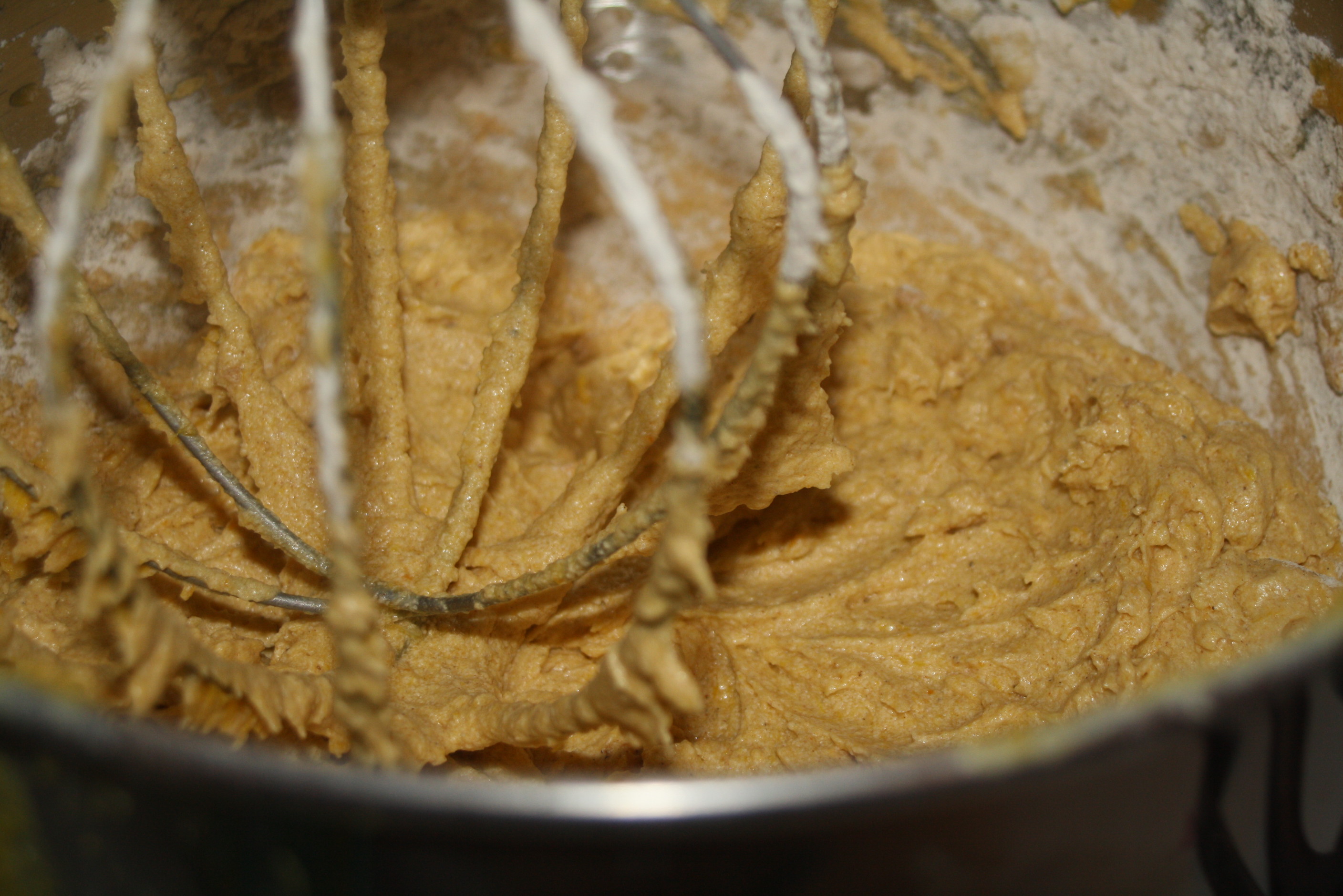 - Beat butter and granulated sugar in a large bowl with an electric mixer at medium-high speed until pale and fluffy, 3 to 5 minutes, then add eggs and beat 1 minute. Reduce speed to low and add flour and pumpkin mixtures alternately in batches, beginning and ending with flour mixture and mixing until batter is just mixed.