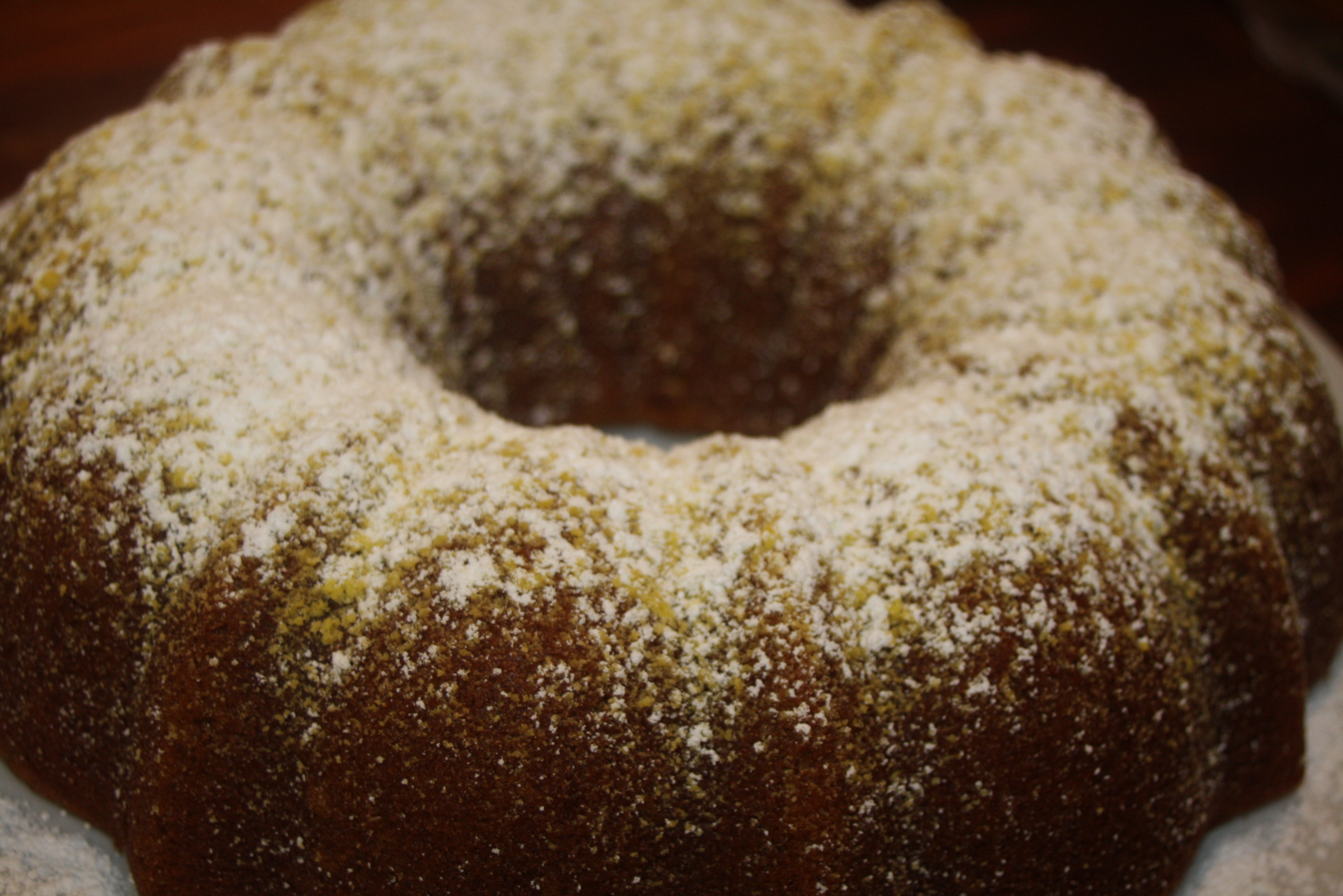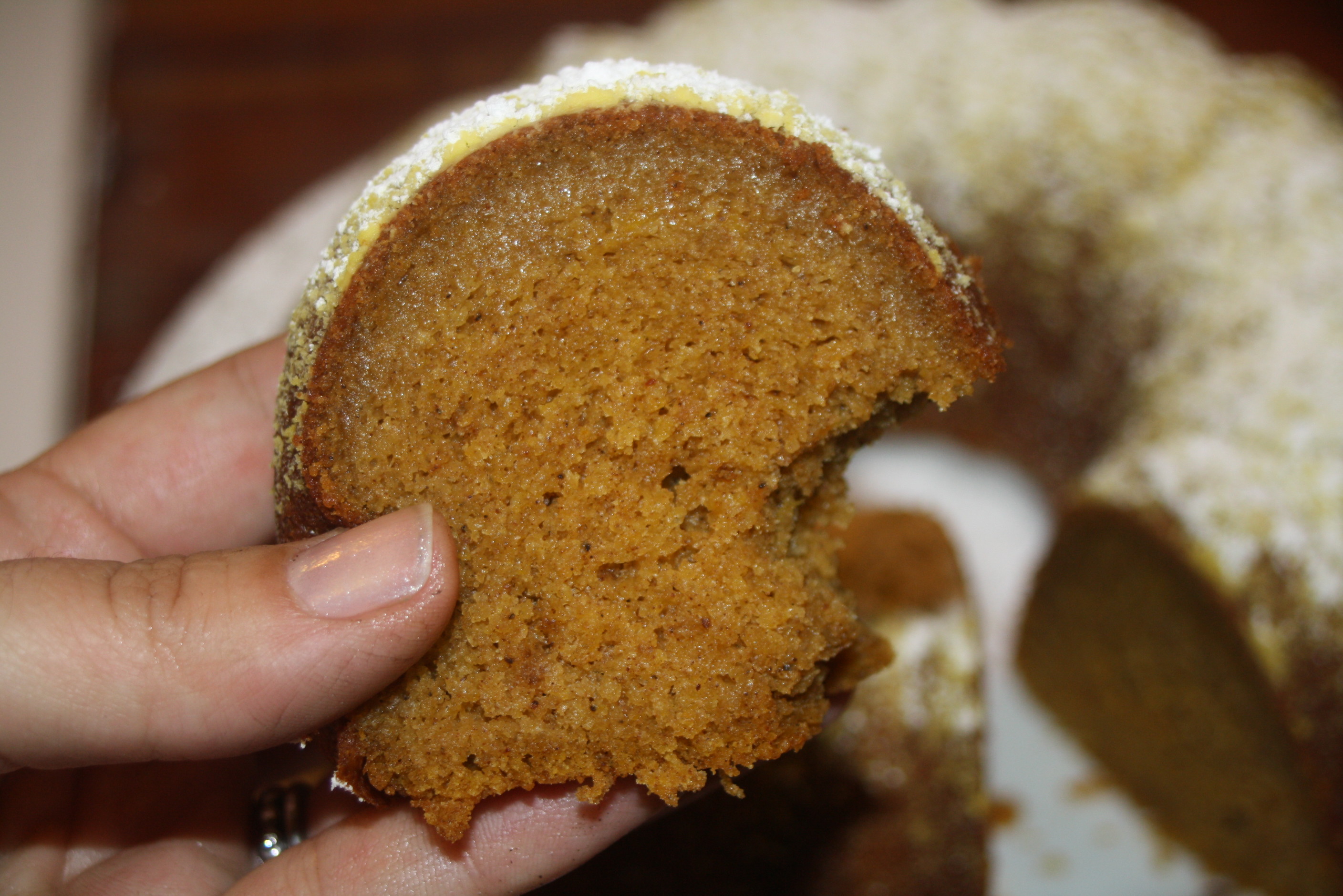 - Dust with a generous amount of powdered sugar – but a word of warning… wait until it is completely cooled first! I was in a rush and did it while the cake was still a little warm and the sugar turned an interesting yellowish, greenish color from the pumpkin and spices. You can kind of see it in the pictures. It may do this anyway, but if you wait until it’s cool and/or right before you serve it, it will be less obvious.