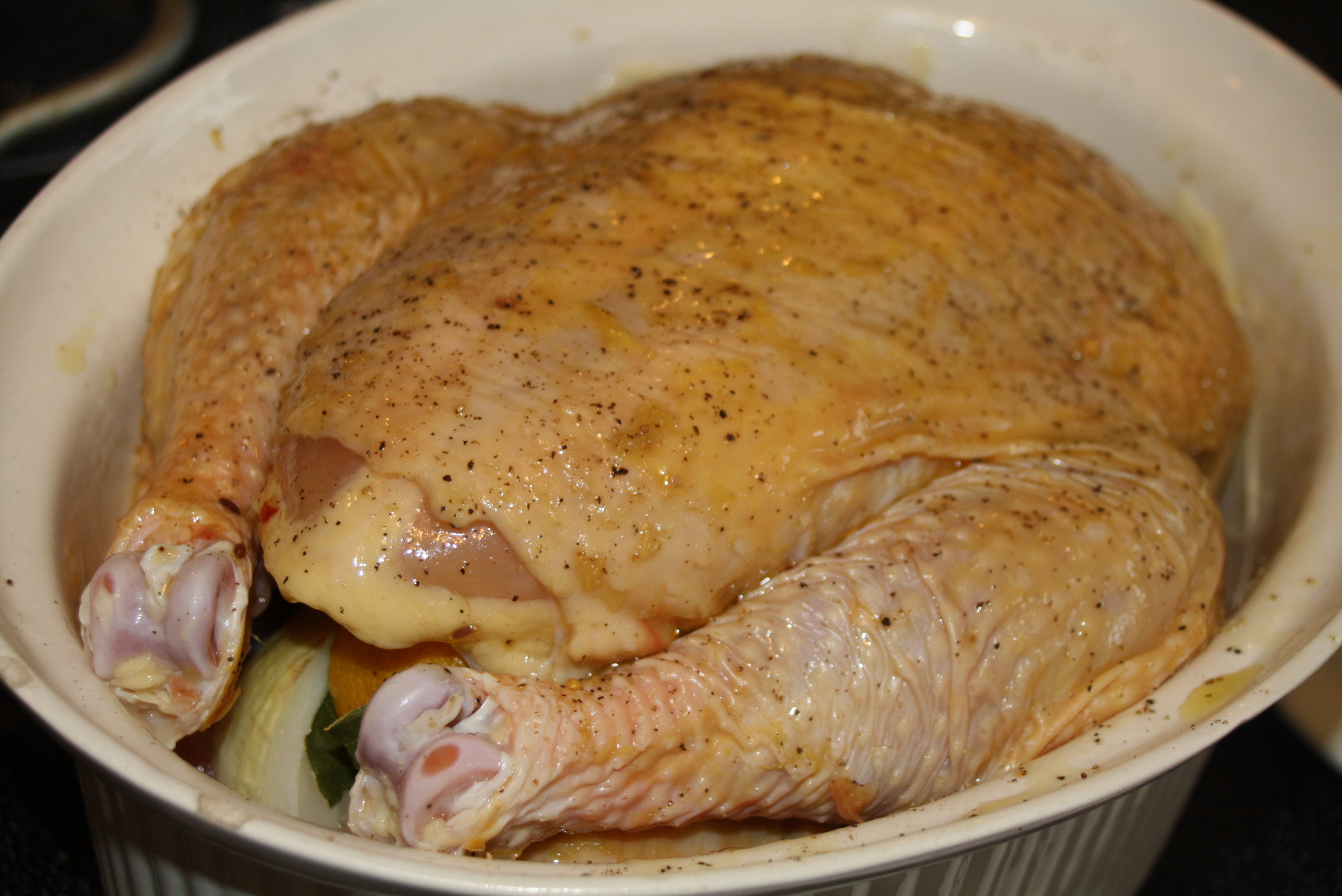 Preheat your oven to 400 degrees. Generously butter the inside of your roasting dish. I find it makes a nicer presentation if your roasting dish is just big enough to fit your roaster. First salt and pepper the bird – inside and out. Fill the bird cavity with onion, lemon, and garlic. massage the legs and breast with butter, then place it breast-up in the roasting pan. If you like, add a about 1/4 cup of your favorite white wine. I’m using a local Bethel Heights Chardonnay in this example because it is a little sweet, spicy, and fruity which I think will go well with the lemony, buttery perfume.