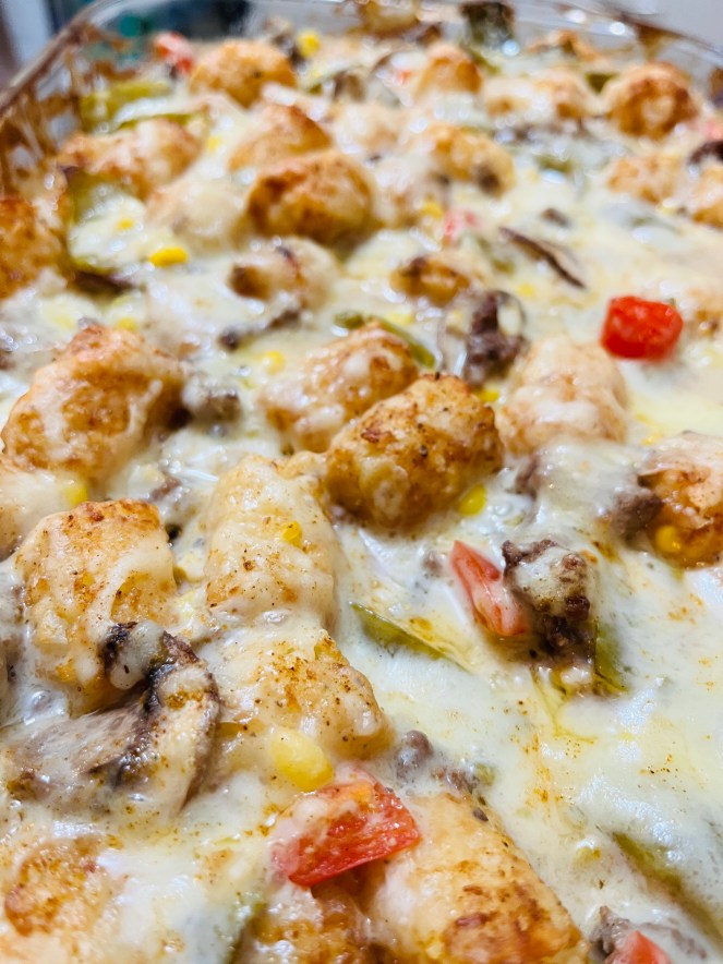 Bake at 375 for about an hour. Mostly you are trying to cook those tots at this point. They usually only take about 25 minutes, but in the casserole like this it is more like baking a potato. Don’t leave it in there too long though. If over cooked, The tots will lose their shape and just fall apart. Still delicious, just not as pretty. I usually check the tots for done-ness around 45 minutes, but it usually takes a full hour.