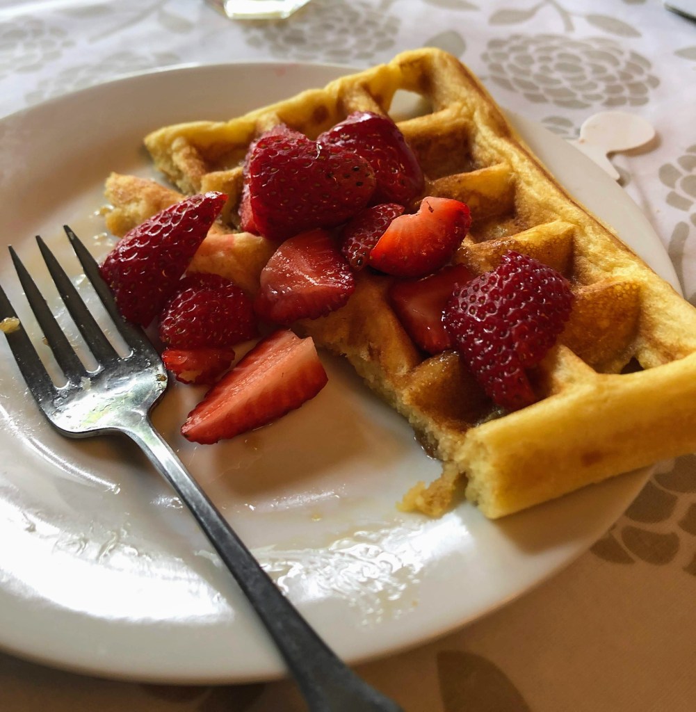 My 9 year old daughter loves waffles. LOVES them. When she started asking me to make them I just used a box mix we had leftover from a camping trip. Not great, but edible. After the second or third time, I remembered two amazing waffle experiences I had while traveling – sourdough waffles in San Francisco, and Belgium (sugared) waffles in New York. I combined them (sort of!) and the combination is heavenly… I prefer to start it after dinner, double the batch, and let it rise in the fridge overnight. Great for slumber parties and busy weekend mornings.