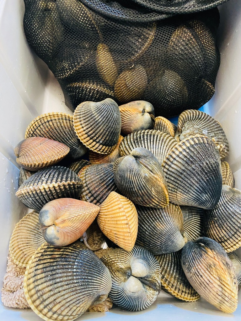 There were plenty of people out there, but they were on the East side of the bay and we had the West side all to ourselves. We completely lucked out on the weather. It was sunny and gorgeous, the water was warm and we actually ended up hauling in around 20 huge cockles – plus a couple of Dungenous Crab!! It was a little greedy of us to take home that many clams, especially since we had no idea it would take that long to clean and eat them!! But then we did it again this spring so whatever. The three ways we liked them most were fried clam strips, creamy clam linguine, and CLAM CHOWDER!