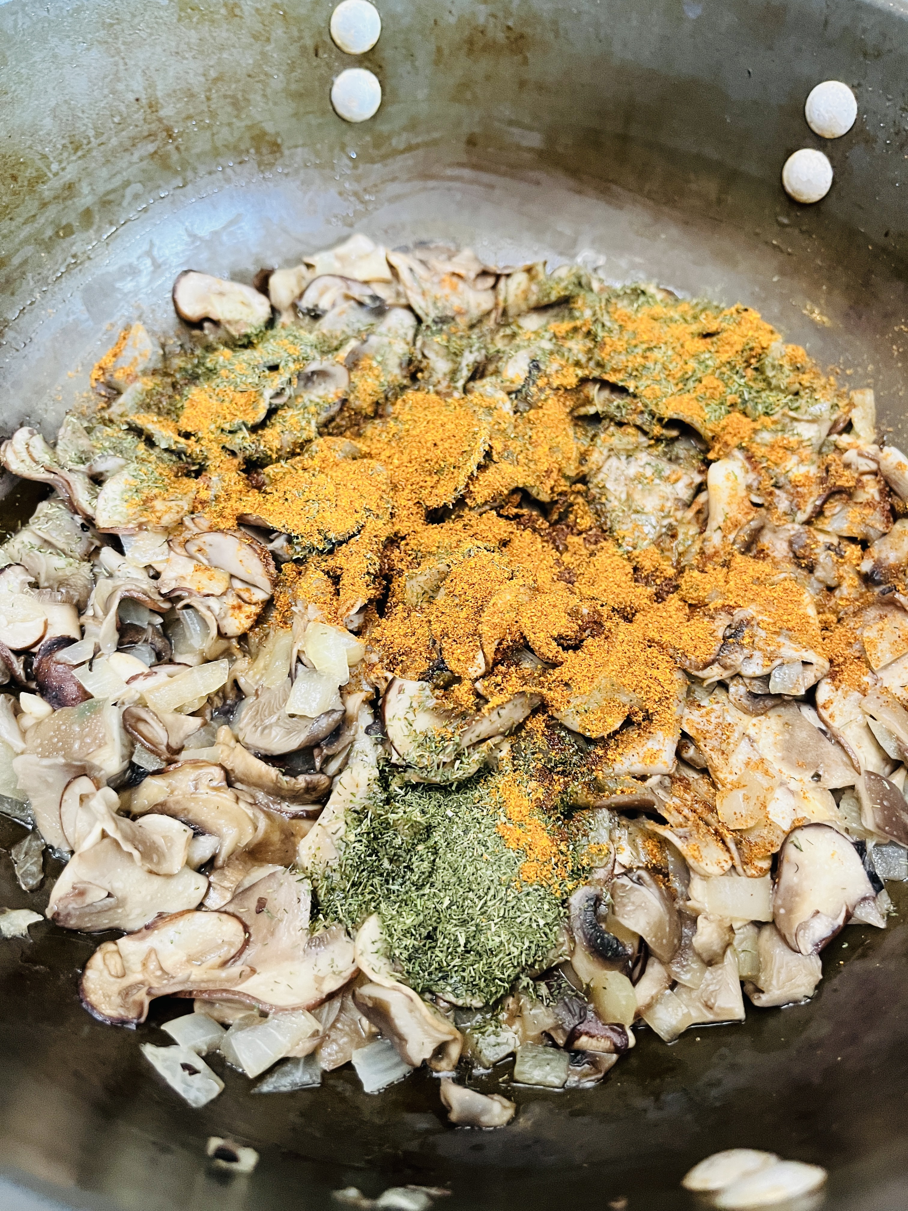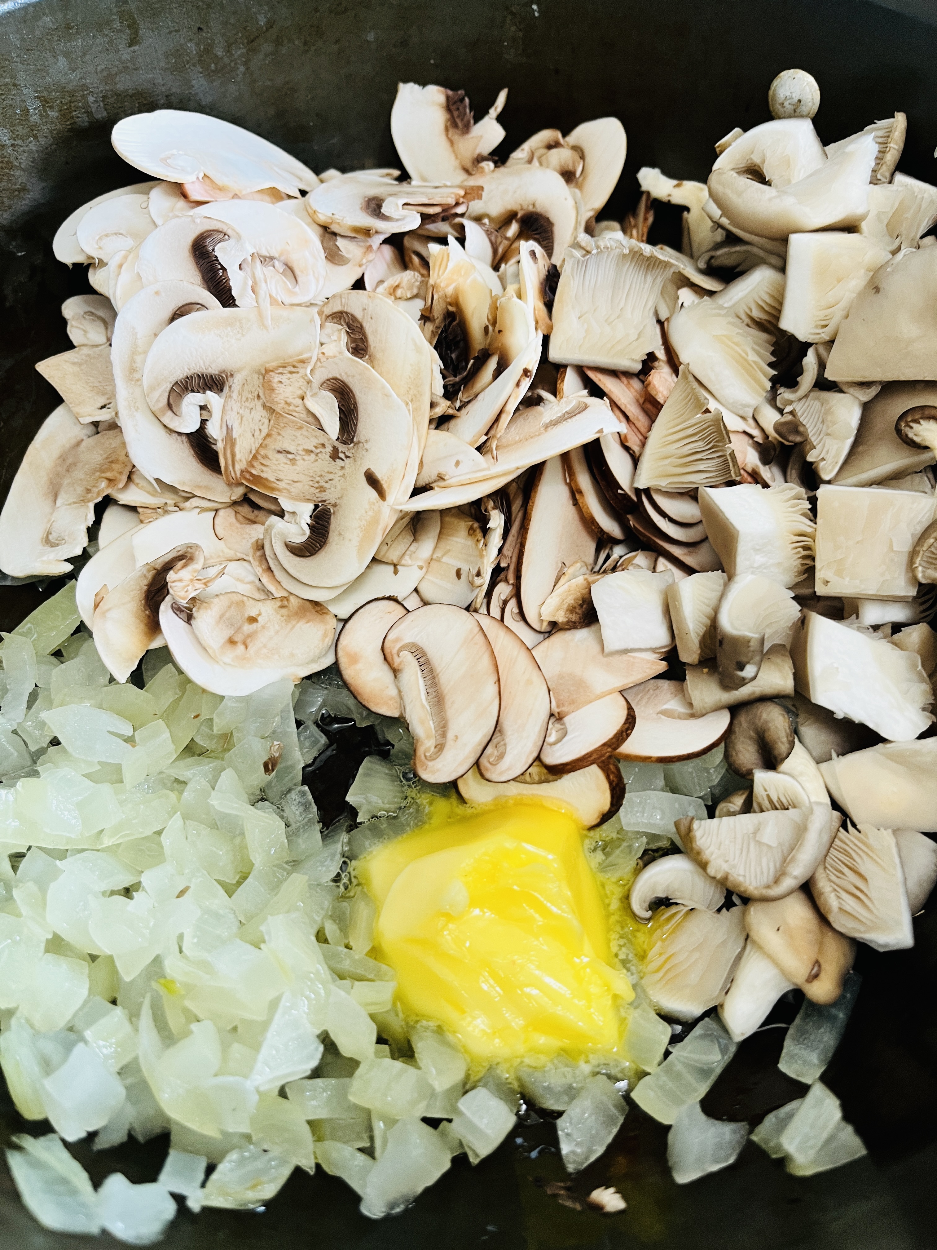 In a heavy pot, sauté the onions in olive oil over medium-low heat until onions are soft and translucent, about 5 minutes. Then add the sliced mushrooms and butter, sauté for another 10 minutes, stirring occasionally.