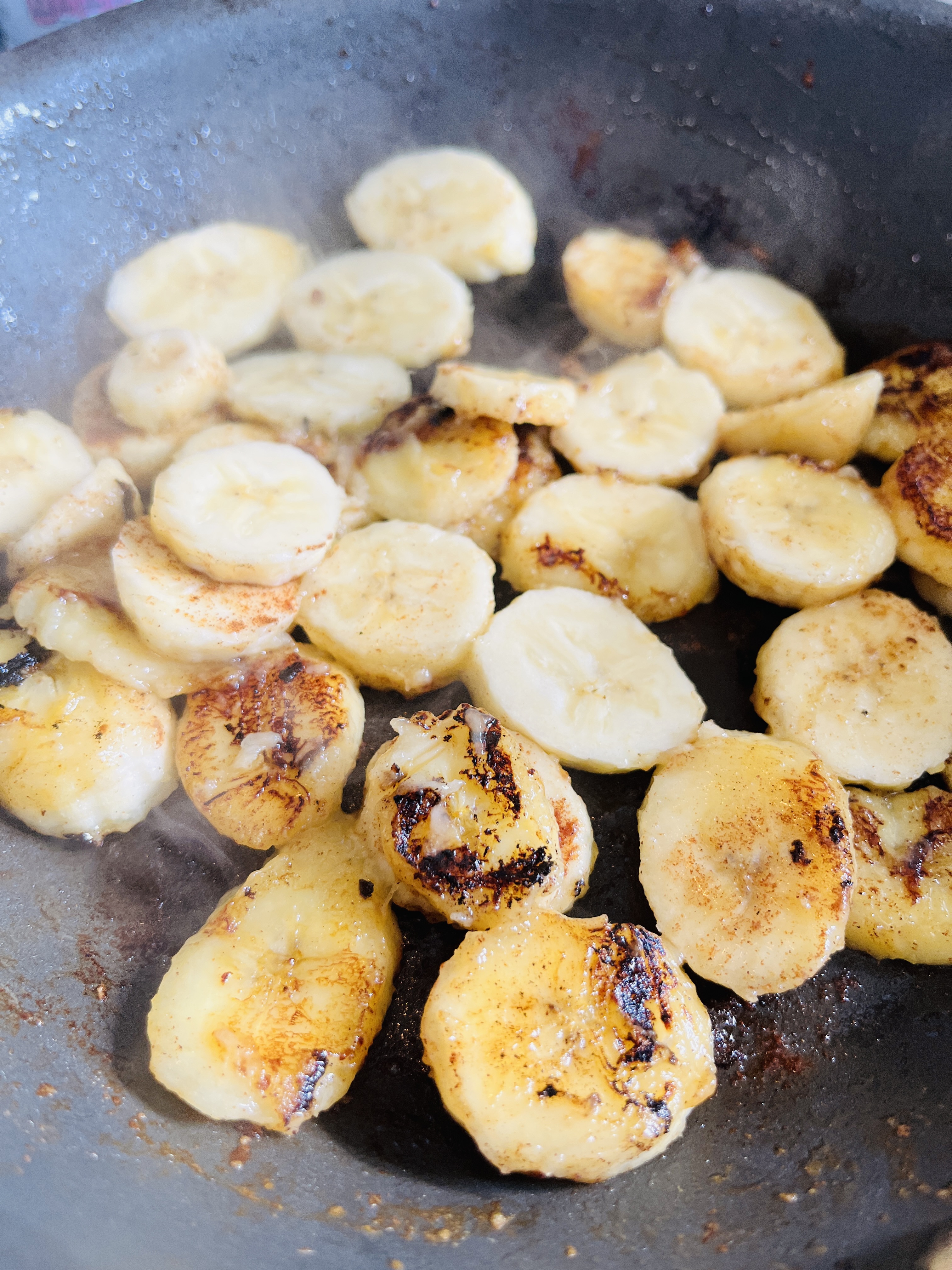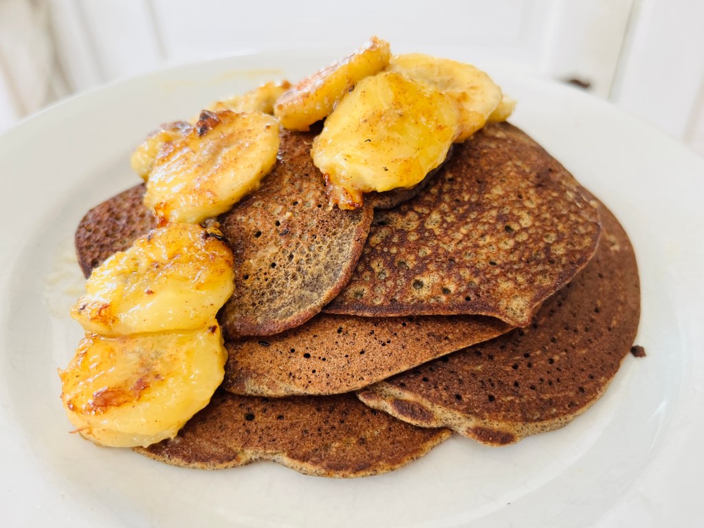 While pancakes are grilling, heat a smaller frying pan on high heat. Add butter, sliced bananas, and sprinkle with cinnamon. Flip the slices after 1-2 minutes (when bottom is starting to caramelize and turn brown). Turn of heat and let the other side caramelize as well. Place on top of the buckwheat pancakes and serve immediately with real maple syrup.