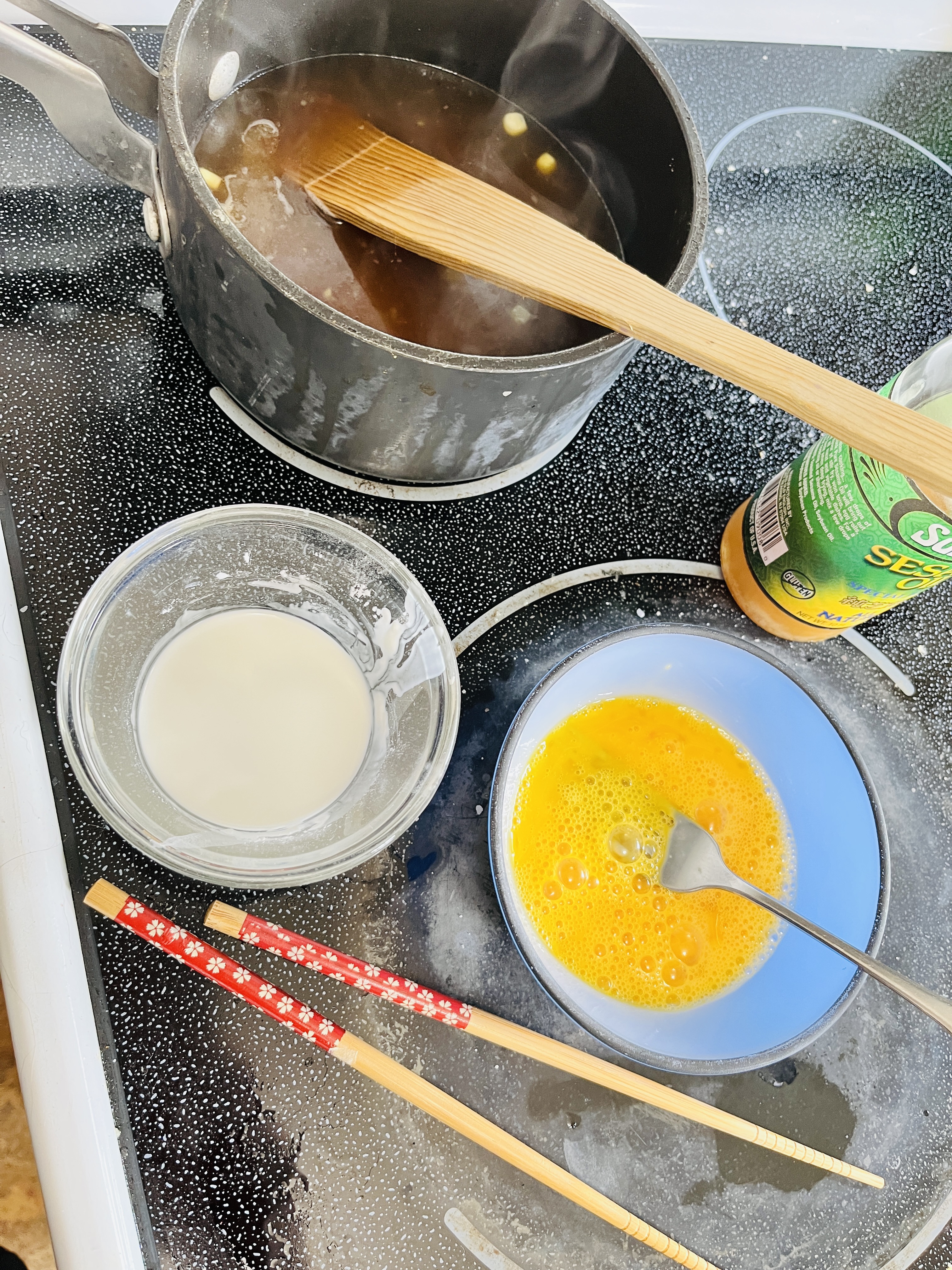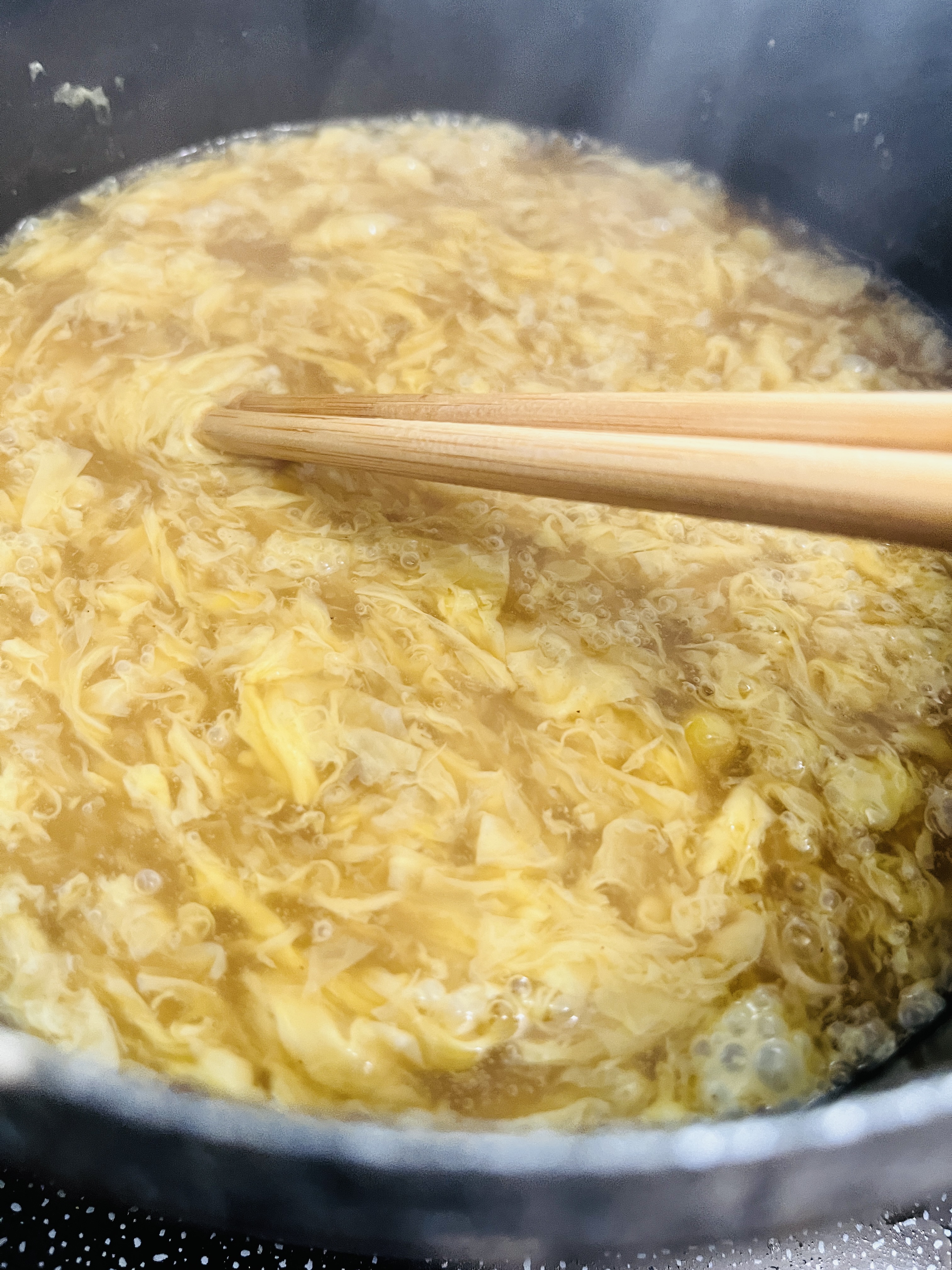 Use chopsticks (or a spoon) to slowly swirl the soup in one direction. Slowly drizzle half the eggs in a thin stream while continuing to swirl with your chopsticks. Wait 30 seconds for the eggs to cook then do the same for the other half.