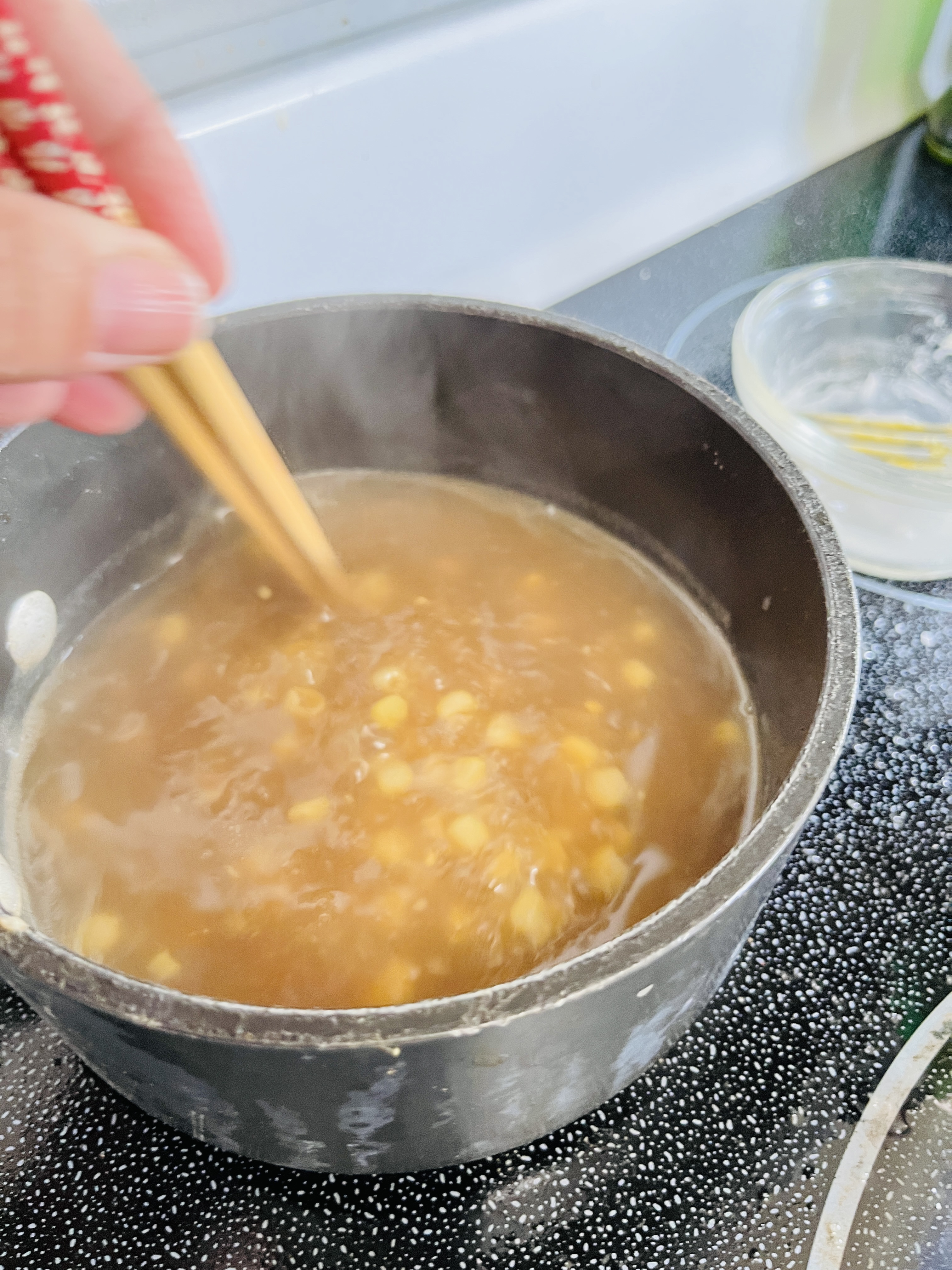 Stir the cornstarch and the water once more as there may be settling. Add it to the stock and stir it until the soup thickens. It may take a couple of minutes – and the water MUST be boiling at least a little. (If you prefer a little thicker consistency, repeat with an additional 1 tsp + 1 tsp water).
