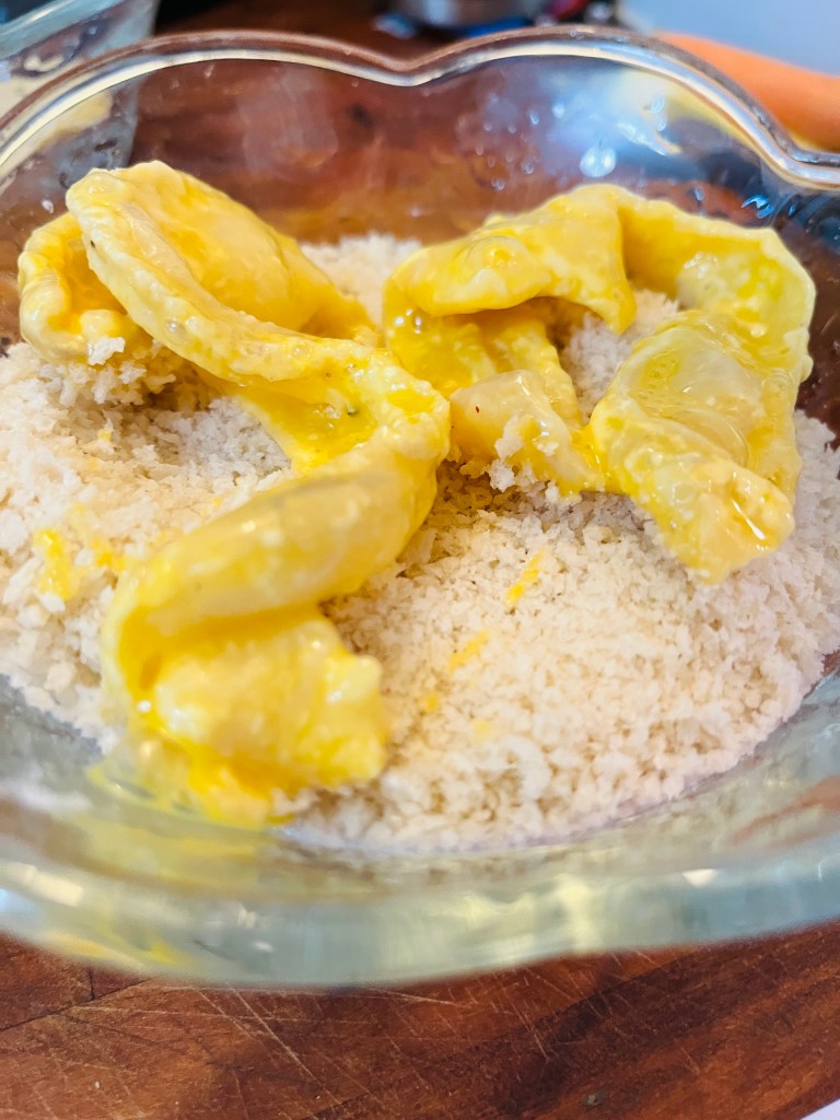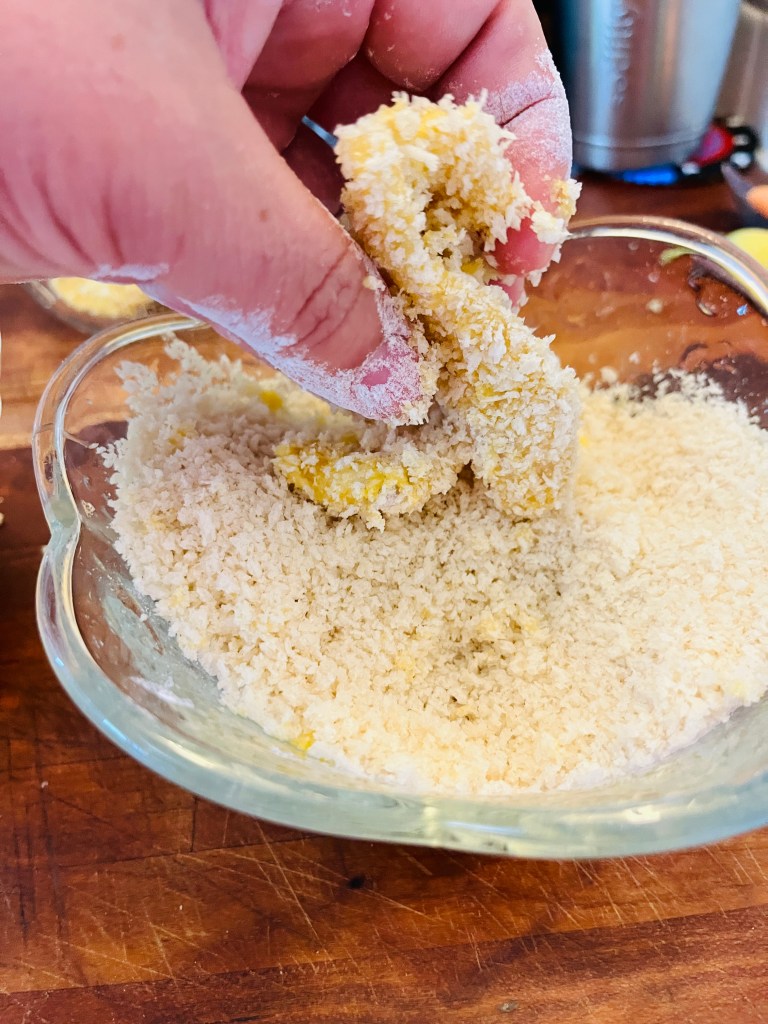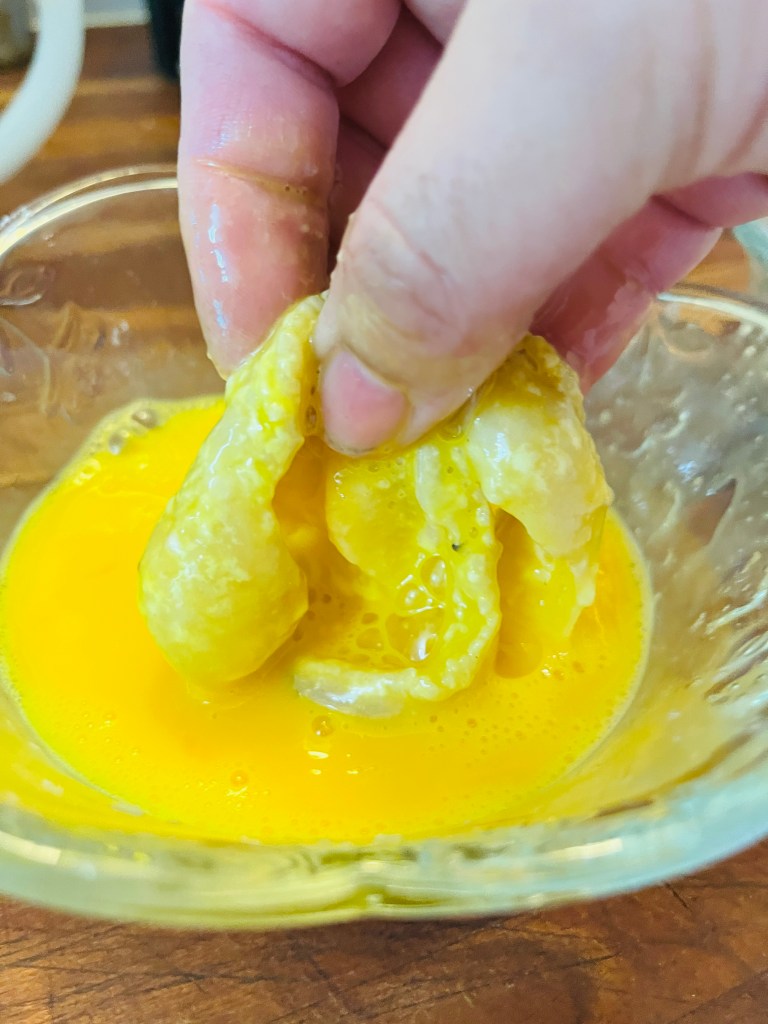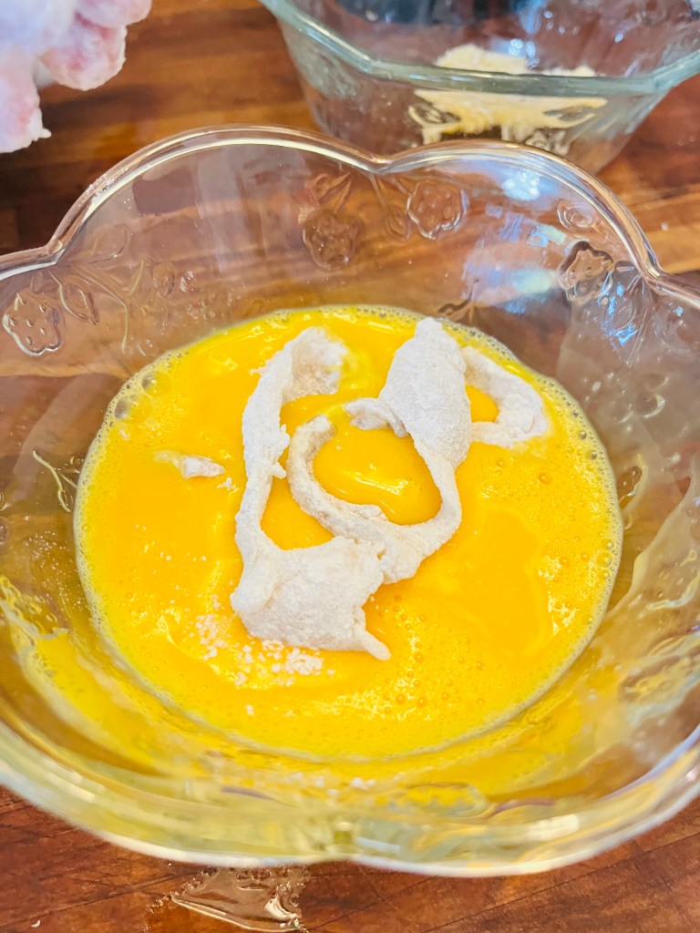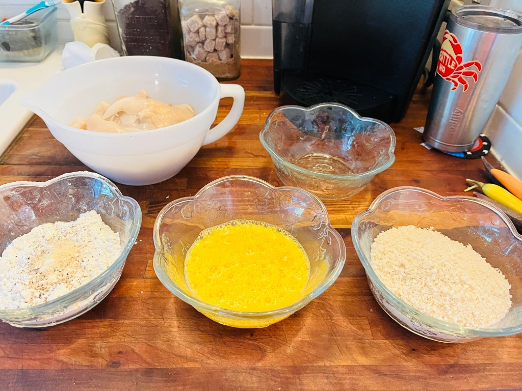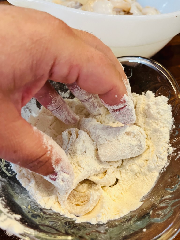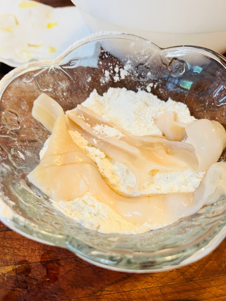 You will dunk each clam piece first in the flour to cover it, then the egg to cover, then the panko to cover. The natural moisture on the clams willmake the flour stick, the flour will make the egg stick, and the egg will make the panko stick. It can be a messy business, but my kids can do it so I know you can 🙂 I keep the waste down by designating a “dry hand (left)” and a “wet hand (right)” so my right hand picks up the clam and drops it into the flour, left hand tosses it around the four and drops it into the egg, right hand tosses it in the egg and drops it in the panko, left hand tosses it around the panko and into the “done” bowl. You can do more than one piece at a time, I usually toss 4-5 in at each pass. And I like to bread all my clams at once while the oil is heating.