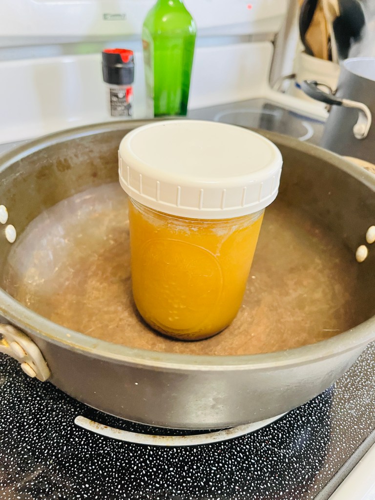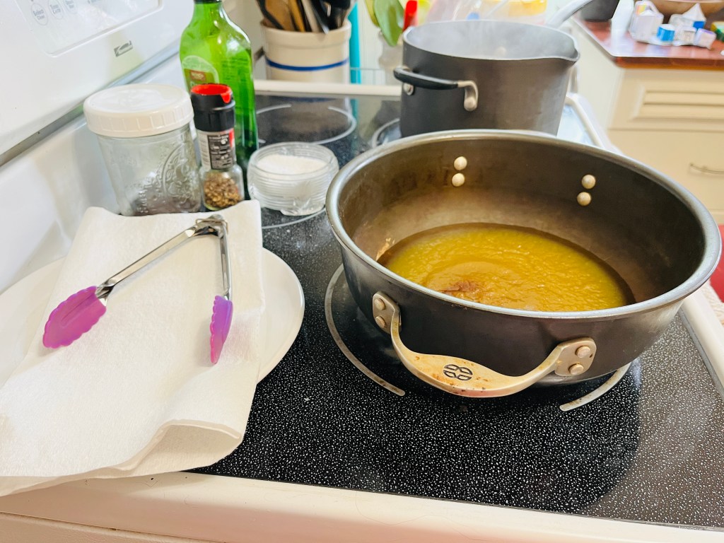 First, start your oil heating in a large cast iron or heavy-bottomed sauce pan. The goal temperature is 375 degrees, on my stove that’s about medium heat. I re-use my frying oil and it’s a mixture of peanut and corn oil. I just strain out the little bits and keep it in a jar in the fridge. If you are using a new bottle you will need about 3 cups of oil.