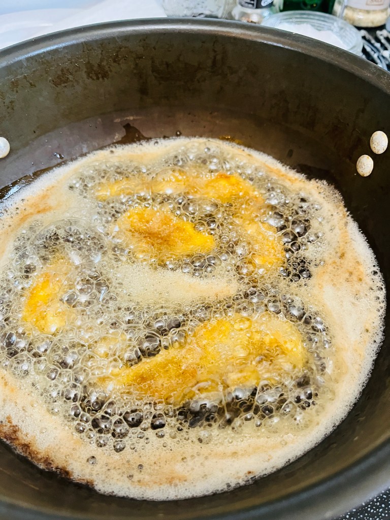 Test your oil by dropping a little bit of breading in. If it bubbles and sizzles it’s ready. If it pops or spatters, turn down the heat a little. Have a plate with a few paper towels (or newspapers) on top, and some tongs or a slotted metal spoon for turning.