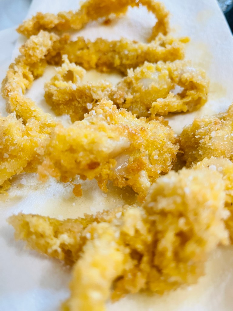 Drop the breaded pieces in a few at a time, turn them over when they start to brown (30 seconds?), remove to the paper towel plate after another 30 seconds. Clams DO NOT want to be over cooked. This is enough time I promise. Sprinkle them with a little salt while they are hot. Repeat with the rest of your breaded clams. Serve with a lemon slice and some cocktail sauce if you like.