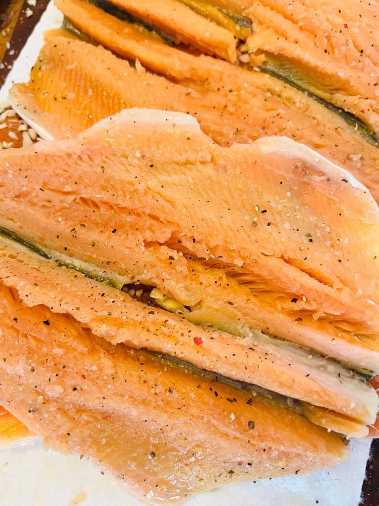 I have always had a love-hate relationship with trout. The flavor is usually bland to fishy, there are ALWAYS a zillion little pin bones… it’s really greasy. My hands smell like fish for hours later. And all of that was especially true when I cooked them using my husband’s favorite recipe.