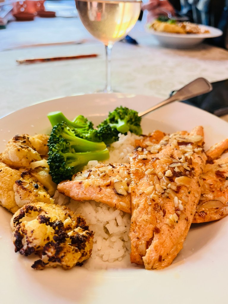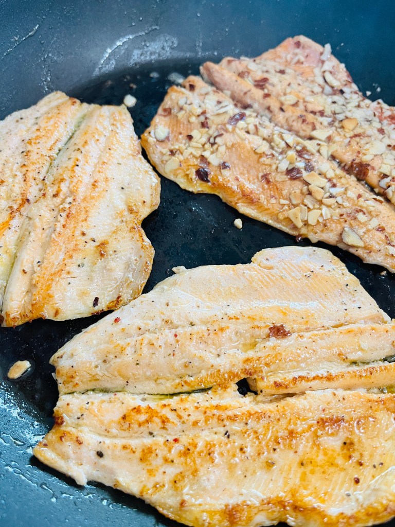 Fry them flesh-down for 1-2 minutes until the almonds develop a nutty smell and a darker brown color. Flip gently and cook on the skin side for another 1-2 minutes, might take a little longer for a large fish. That’s it! I try to peel the skin off my fillets when I’m putting them on the plate, but you can also just flip one side over and serve it looking like a while fish for show. Enjoy!