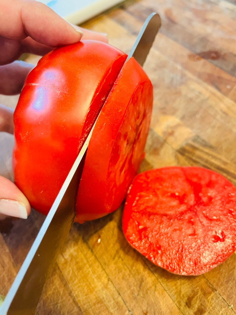 If I’m being completely honest… I’m not the biggest tomato fan. Don’t come for me!! I’ll eat them, but I don’t crave them like some of you do. So how can it be that THIS is my all-time favorite sandwich? It’s more about the seeds than the flesh for me so I have found a few varieties of tomato that have smaller seed cavities and I use them. Then I can enjoy the sweet, acidic, sunshine-y goodness of a ripe summer tomato without being grossed out, lol!