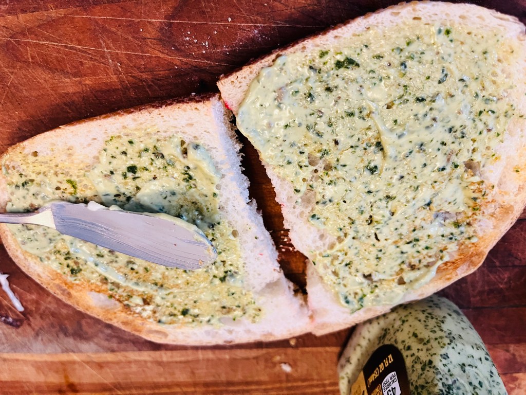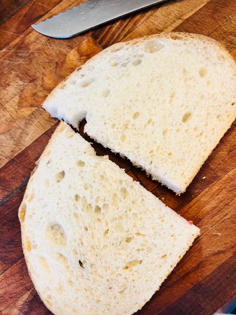 Arrange the sliced fresh mozzarella on top of the pesto mayo so it covers most of the bread. Pop them in the oven/air fryer and broil at 400 for a few minutes to warm up the cheese and toast the edges of the bread.