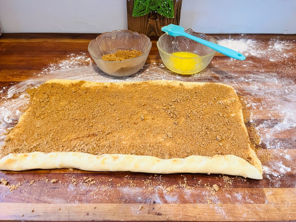 Use a rolling pin to roll each piece of dough into (roughly) 8×14 inch rectangles. Melt your butter in the microwave, then use a pastry brush to spread it all over over your dough pieces. Mix the brown sugar and cinnamon in a small bowl and sprinkle a thin layer all over the buttered dough.