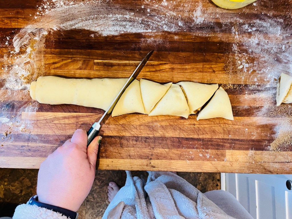 Roll the dough up along the 14-inch side. Your goal is to make a long snake, not a short snake. Cut the rolls into 7-8 alternating triangles (should be 2-inches at the base, 1/2-inch at the tip). Place them big side DOWN on a lightly greased cookie sheet or silpat/parchment. Use your finger or a greased chopstick to press down firmly in the center of the roll so the sides squish out a bit. Cover with greased saran or a tea towel and let rise for 1 hour.