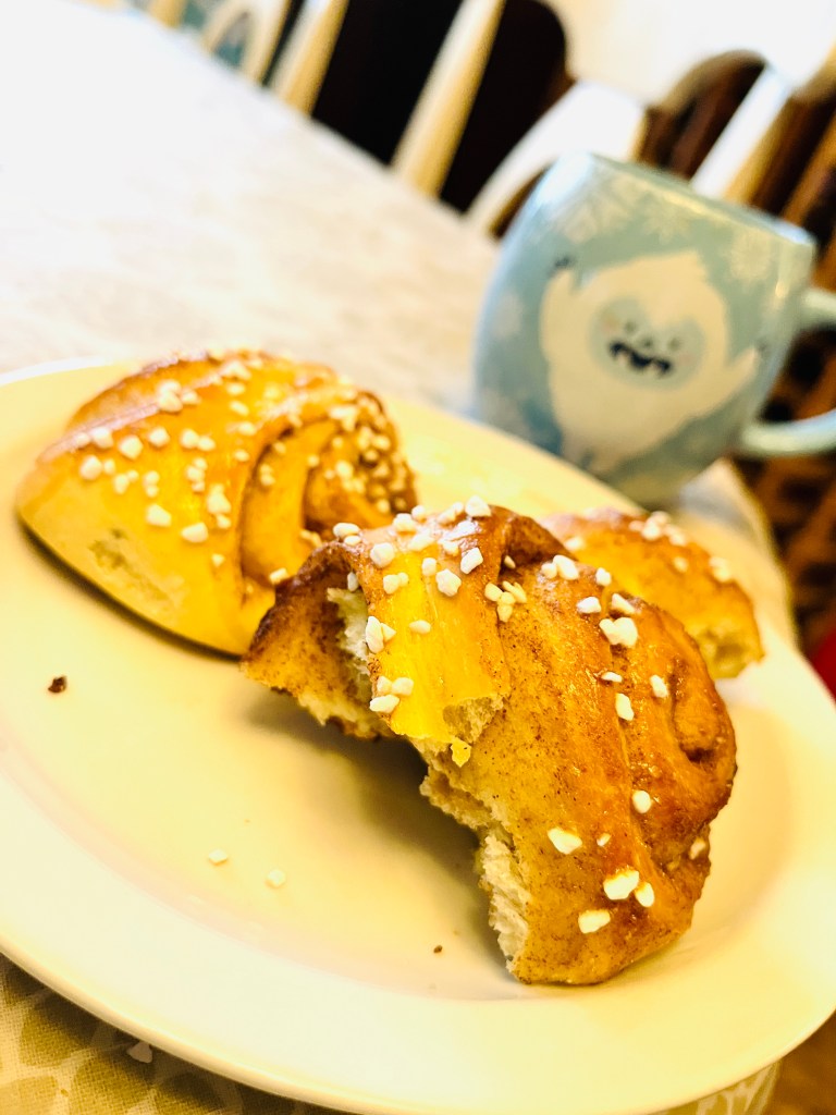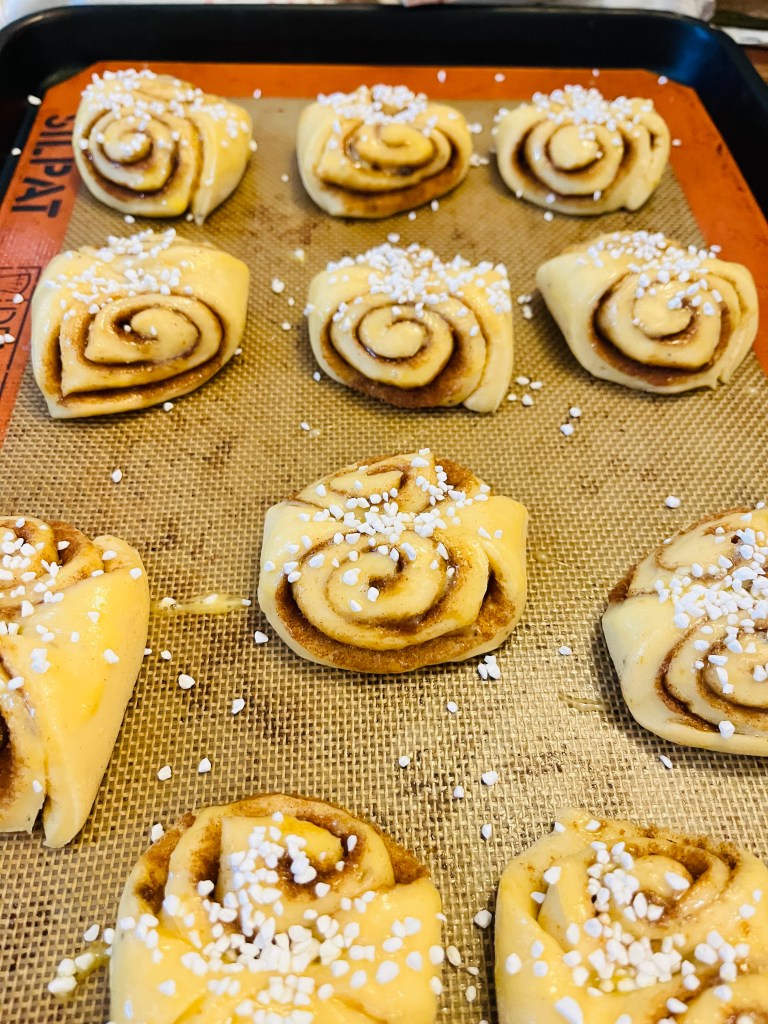 Preheat oven to 400 degrees. Whisk an egg in a small bowl and use a pastry brush to brush each roll with egg. Then, sprinkle some Swedish/rae/pearl sugar on each roll. Bake in the top half of your oven for 10-15 minutes or until golden brown – NOTE: bottoms may be dark, that’s okay. Serve plain or with lingonberry jam (IKEA!) and butter. Great with coffee any time of the day!