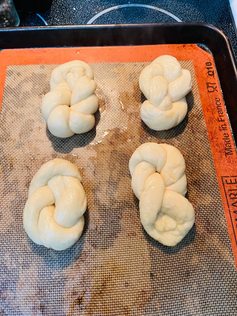Turn the dough out onto a slightly oiled work surface and divide into 8 equal pieces. Roll out each piece of dough into a 24-inch rope. Make a U-shape with the rope, holding the ends of the rope, cross them over each other and press onto the bottom of the U in order to form the shape of a pretzel. Place onto the parchment-lined baking sheet