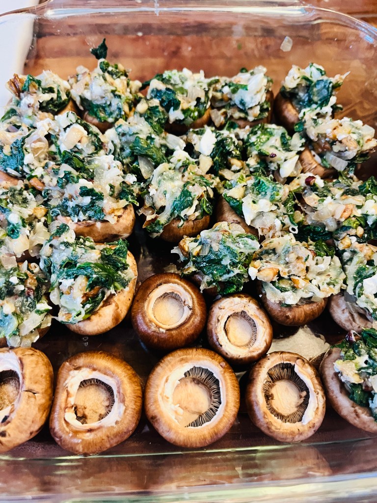 Add the pecans to the onions and cook for another minute. Add the spinach and cook for another 5 minutes, stirring constantly. Remove from the heat and cool slightly. Stir in the cheeses. Arrange the mushrooms, cavity side up, in a baking dish. Divide the spinach mixture evenly among the mushroom caps.