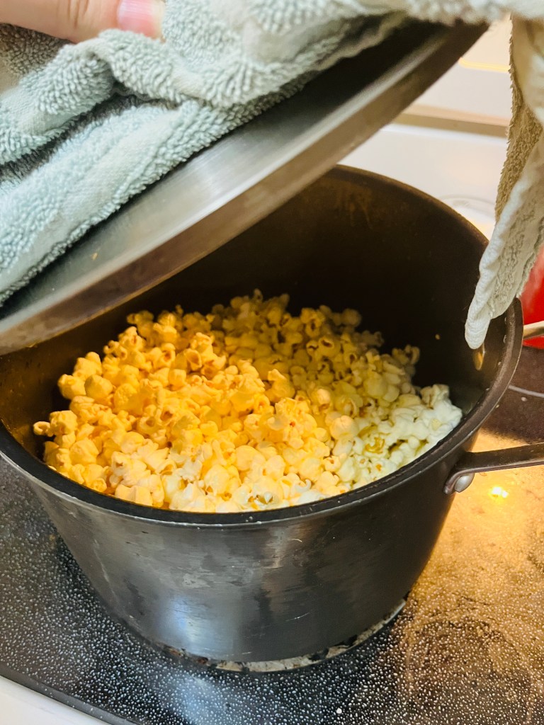 Dump in the rest of the kernels and cover the pot with a lid or towel – or both in my case. The kernels will start popping away in there. Leave the lid on unless you want them all over your floor 🙂 The trick here is to SHAKE the pan every 15-20 seconds. If you don’t, the popped popcorn will burn and the un-popped kernels will not be able to reach the hot oil on the bottom. Give it a side-to-side shake or hearty up-and-down hoist. Mix it up, and keep it moving. Have fun with it. When the pot is about half way full, you can remove the lid, but keep shaking as well as you can. You’ll know you’re done when the POPS! are down to every 5 seconds and the popcorn is near the top of your pot.